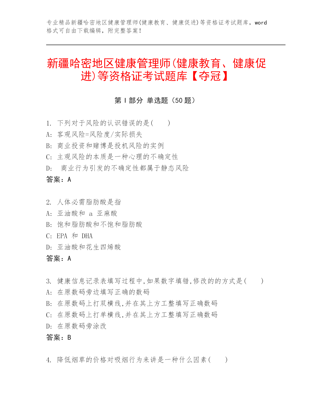 新疆哈密地区健康管理师(健康教育、健康促进)等资格证考试题库【夺冠】.docx