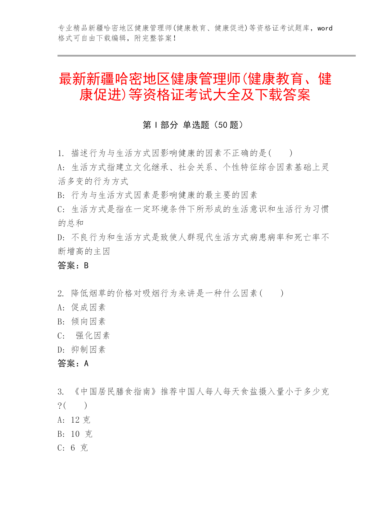 最新新疆哈密地区健康管理师(健康教育、健康促进)等资格证考试大全及下载答案.docx