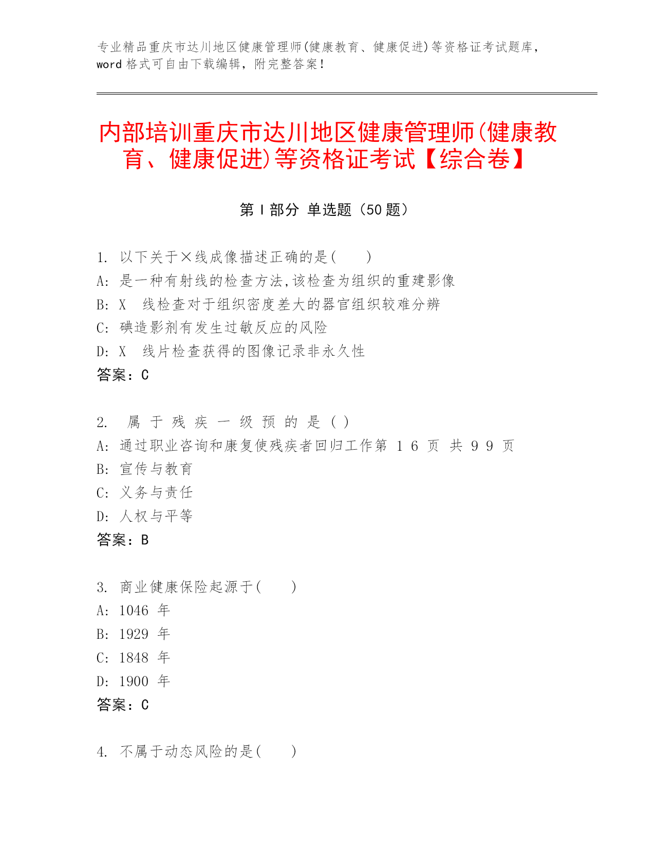 专业精品重庆市达川地区健康管理师(健康教育、健康促进)等资格证考试题库,word格式可自由下载编辑,附完整答案!内部培训重庆市达川地区健康管理师(健康教育、健康促进)等资格证考试【综合卷】第I部分单选题(50题)1.以下关于×线成像描述正确的是()A:是一种有射线的检查方法,该检查为组织的重建影像B:X线检查对于组织密度差大的器官组织较难分辨C:碘造影剂有发生过敏反应的风险D:X线片检查获得的图像记录非永久性答案:C2.属于残疾一级预的是()A:通过职业咨询和康复使残疾者回归工作B:宣传与教育C:义务与责