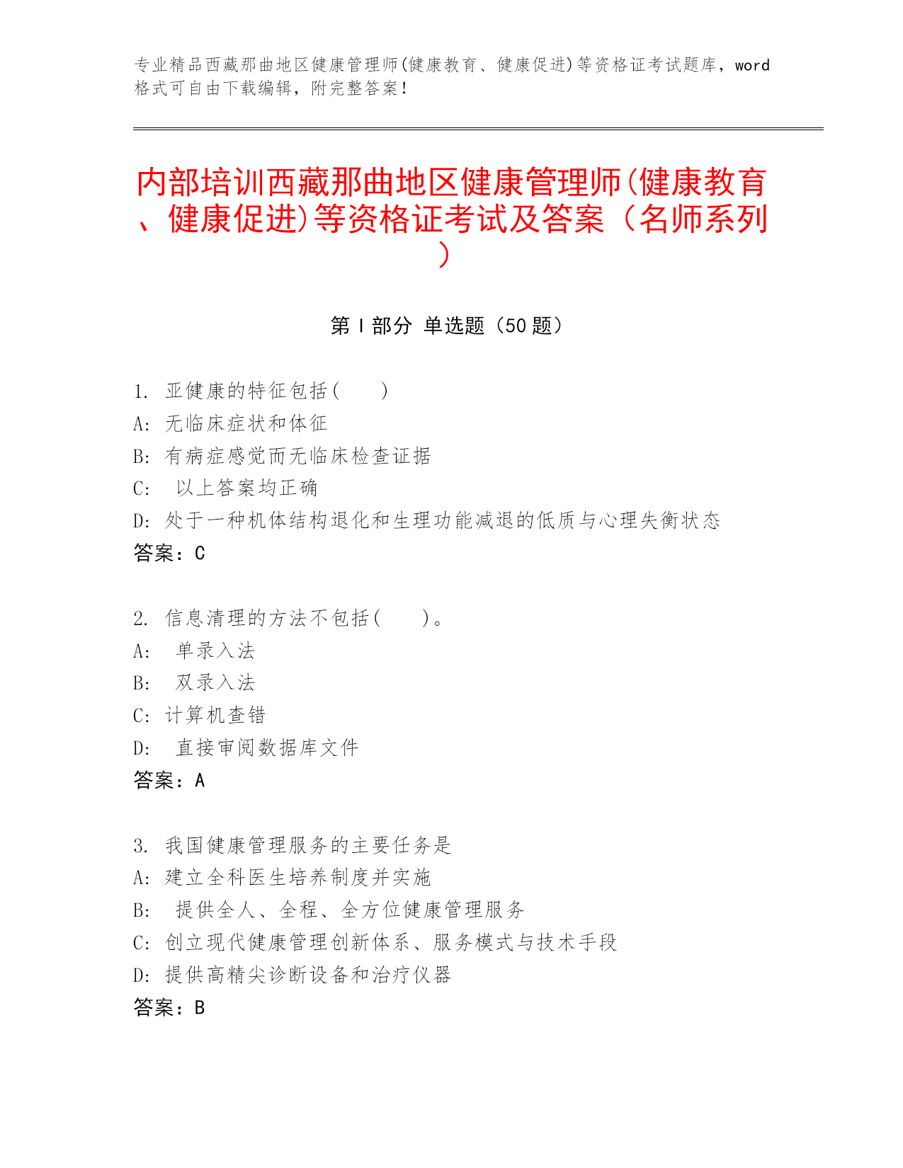 内部培训西藏那曲地区健康管理师(健康教育、健康促进)等资格证考试及答案(名师系列).docx