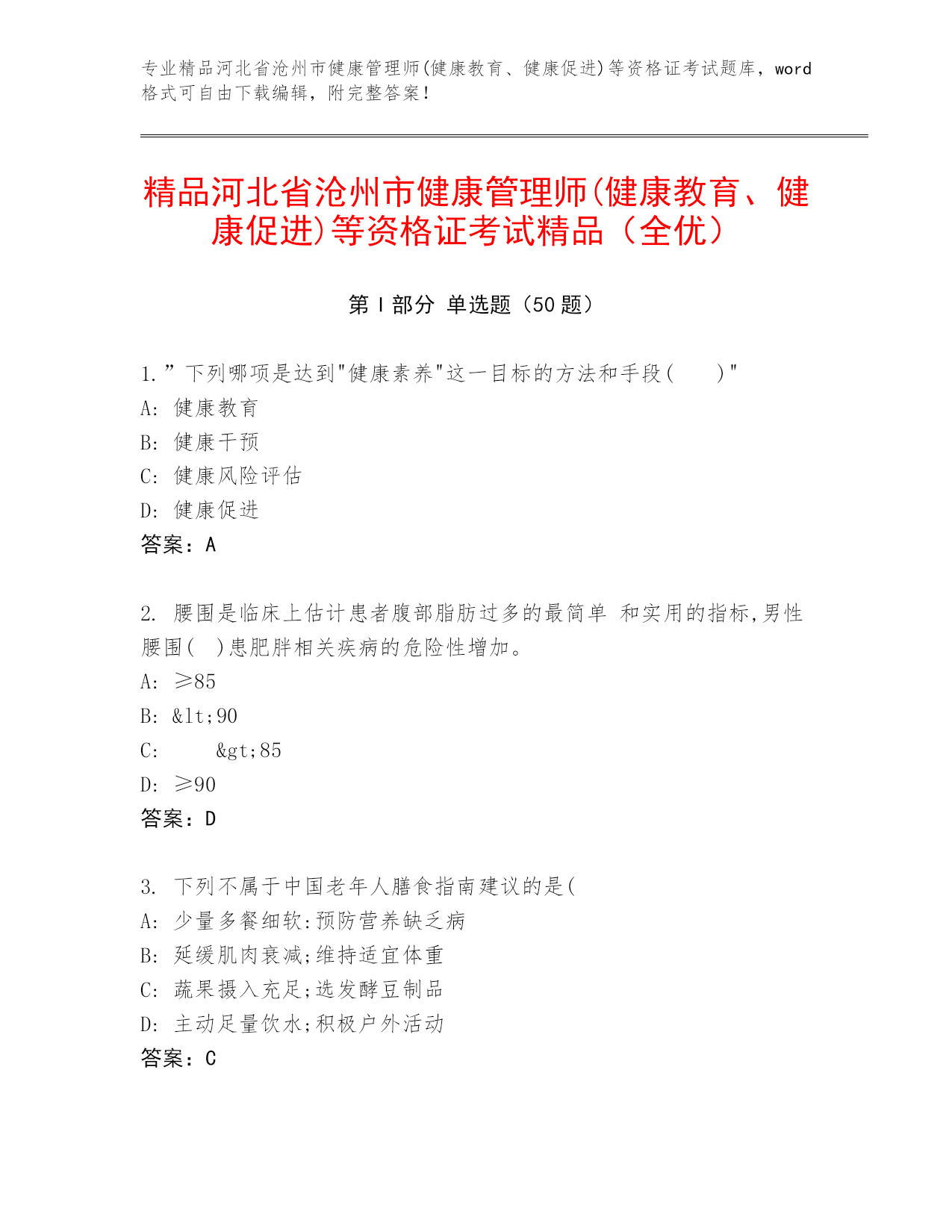 精品河北省沧州市健康管理师(健康教育、健康促进)等资格证考试精品(全优).docx
