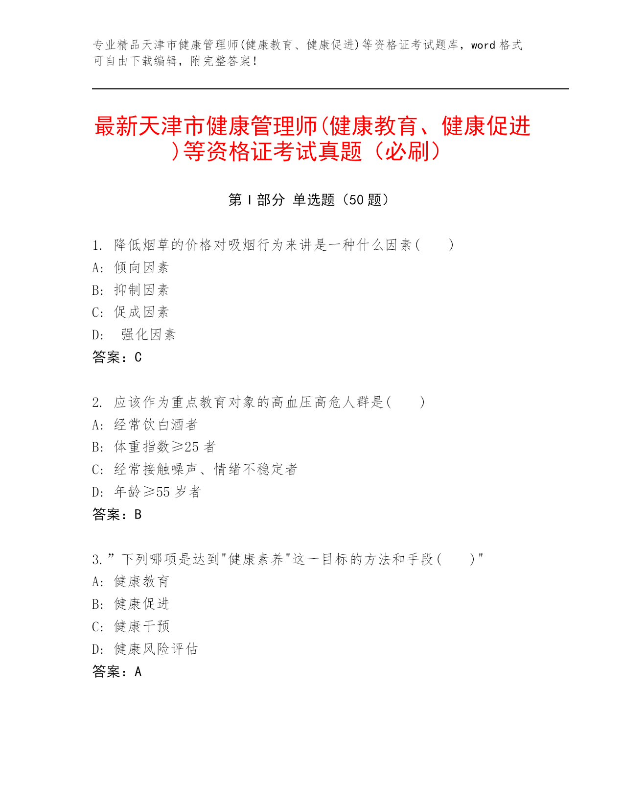 专业精品天津市健康管理师(健康教育、健康促进)等资格证考试题库,word格式可自由下载编辑,附完整答案!最新天津市健康管理师(健康教育、健康促进)等资格证考试真题(必刷)第I部分单选题(50题)1.降低烟草的价格对吸烟行为来讲是一种什么因素()A:倾向因素B:抑制因素C:促成因素D:强化因素答案:C2.应该作为重点教育对象的高血压高危人群是()A:经常饮白酒者B:体重指数≥25者C:经常接触噪声、情绪不稳定者D:年龄≥55岁者答案:B3.”下列哪项是达到"健康素养"这一目标的方法和手段()"A:健康教育B