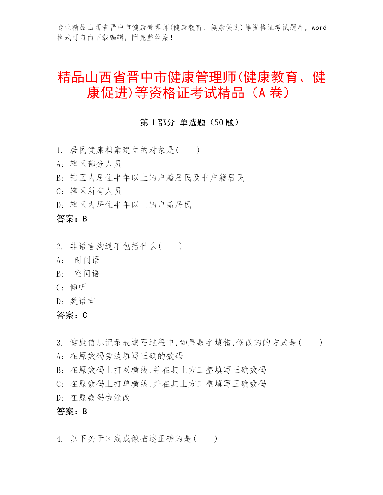 精品山西省晋中市健康管理师(健康教育、健康促进)等资格证考试精品(A卷).docx