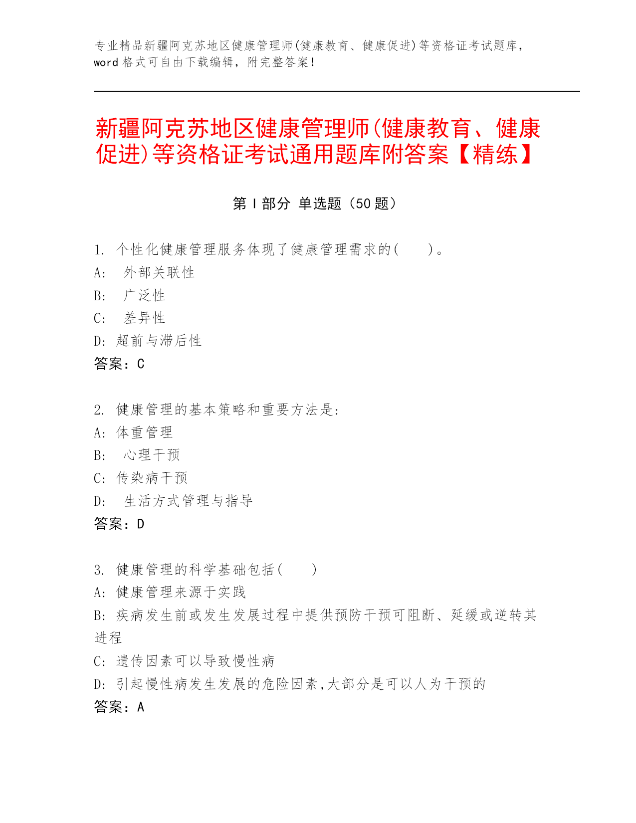 新疆阿克苏地区健康管理师(健康教育、健康促进)等资格证考试通用题库附答案【精练】.docx