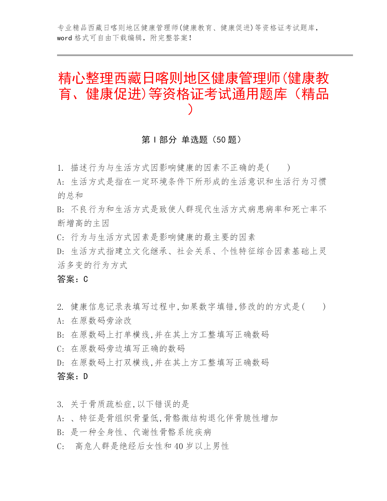 专业精品辽宁省抚顺市健康管理师(健康教育、健康促进)等资格证考试题库,word格式可自由下载编辑,附完整答案!优选辽宁省抚顺市健康管理师(健康教育、健康促进)等资格证考试及答案免费第I部分单选题(50题)1.火灾或洪水造成的财产损坏属于()A:纯粹风险B:主观风险C:投机风险D:动态风险答案:A2.以下哪项不是健康管理师的职业功能()A:指导、培训、研究B:健康监测C:选择保险D:健康风险评估和分析答案:C3.《中国居民膳食指南》推荐中国人每人每天食盐摄入量小于多少克?()A:6克B:8克C:12克D:1