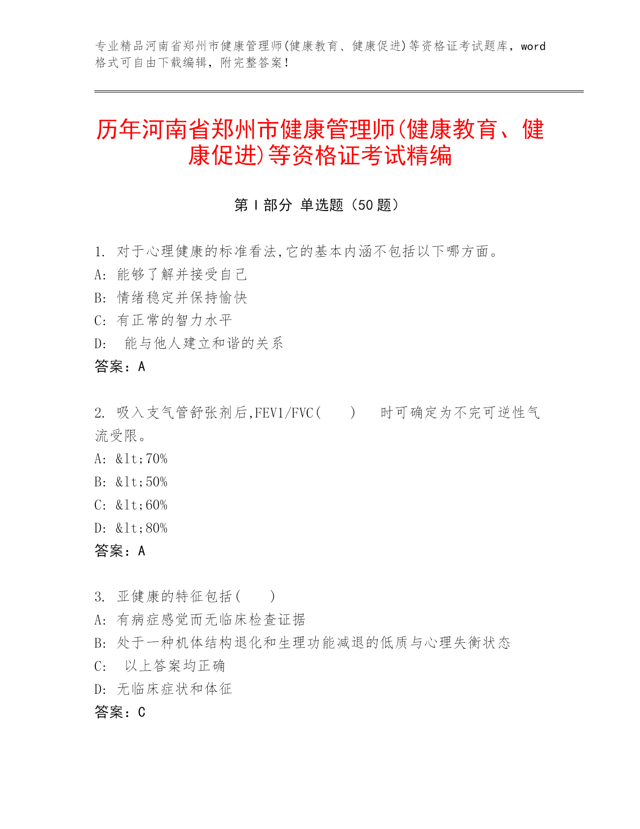 专业精品河南省郑州市健康管理师(健康教育、健康促进)等资格证考试题库,word格式可自由下载编辑,附完整答案!历年河南省郑州市健康管理师(健康教育、健康促进)等资格证考试精编第I部分单选题(50题)1.对于心理健康的标准看法,它的基本内涵不包括以下哪方面。A:能够了解并接受自己B:情绪稳定并保持愉快C:有正常的智力水平D:能与他人建立和谐的关系答案:A2.吸入支气管舒张剂后,FEV1/FVC()时可确定为不完可逆性气流受限。A:<70%B:<50%C:<60%D:<80%答案:A3