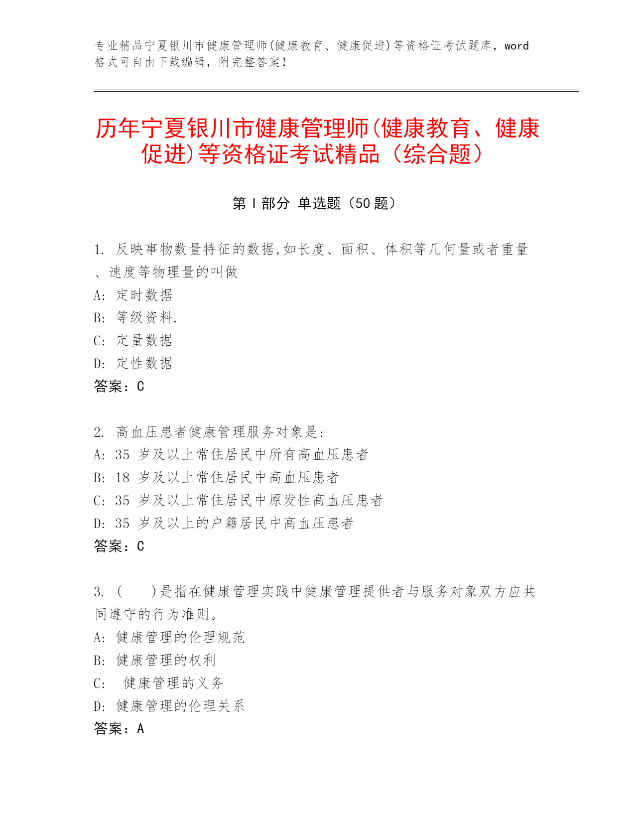 专业精品宁夏银川市健康管理师(健康教育、健康促进)等资格证考试题库,word格式可自由下载编辑,附完整答案!历年宁夏银川市健康管理师(健康教育、健康促进)等资格证考试精品(综合题)第I部分单选题(50题)1.反映事物数量特征的数据,如长度、面积、体积等几何量或者重量、速度等物理量的叫做A:定时数据B:等级资料.C:定量数据D:定性数据答案:C2.高血压患者健康管理服务对象是:A:35岁及以上常住居民中所有高血压患者B:18岁及以上常住居民中高血压患者C:35岁及以上常住居民中原发性高血压患者D:35岁及以