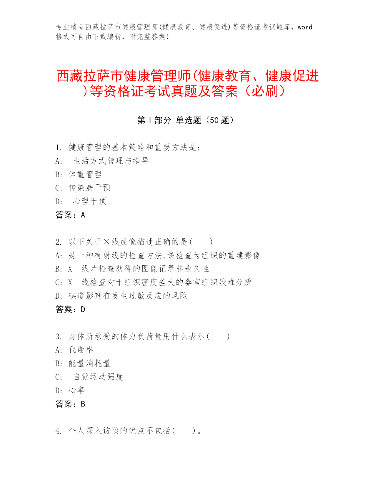 专业精品西藏拉萨市健康管理师(健康教育、健康促进)等资格证考试题库,word格式可自由下载编辑,附完整答案!西藏拉萨市健康管理师(健康教育、健康促进)等资格证考试真题及答案(必刷)第I部分单选题(50题)1.健康管理的基本策略和重要方法是:A:生活方式管理与指导B:体重管理C:传染病干预D:心理干预答案:A2.以下关于×线成像描述正确的是()A:是一种有射线的检查方法,该检查为组织的重建影像B:X线片检查获得的图像记录非永久性C:X线检查对于组织密度差大的器官组织较难分辨D:碘造影剂有发生过敏反应的风险答