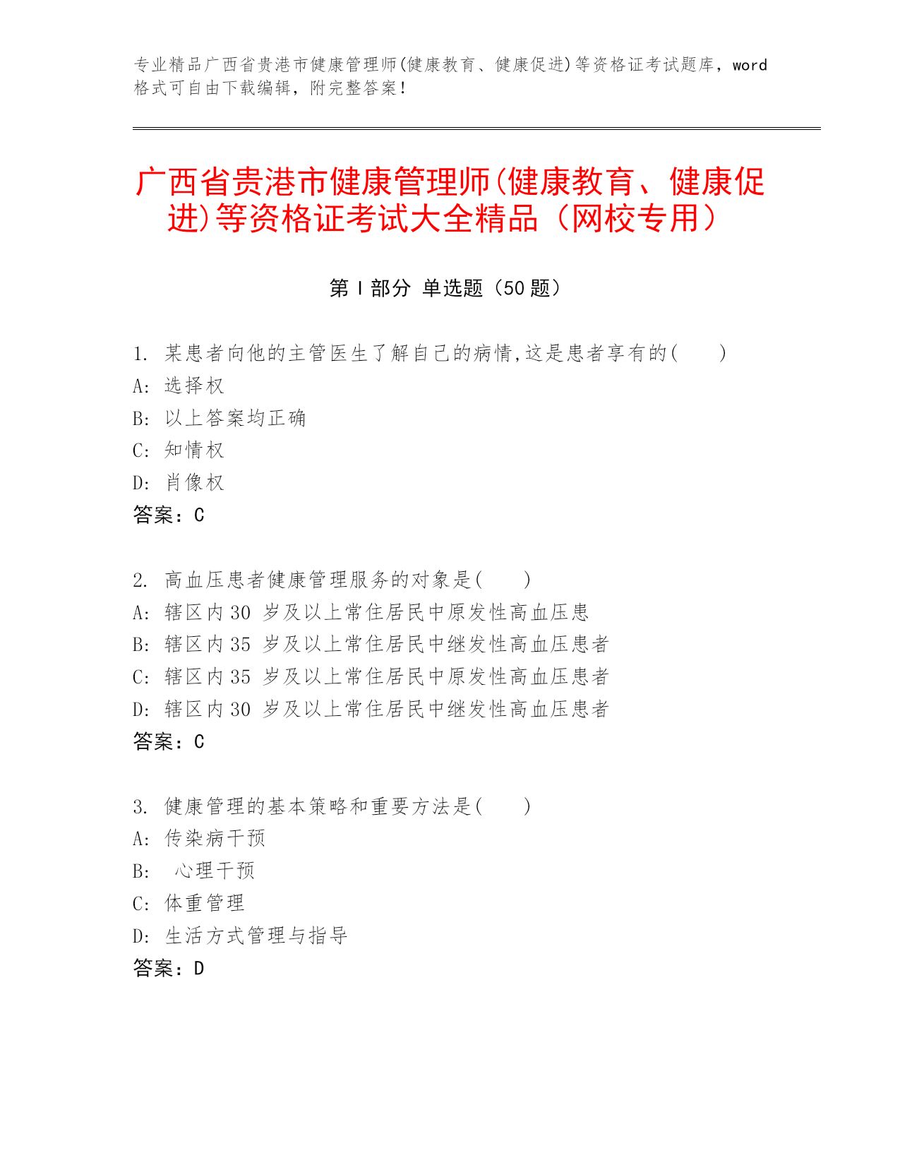 专业精品广西省贵港市健康管理师(健康教育、健康促进)等资格证考试题库,word格式可自由下载编辑,附完整答案!广西省贵港市健康管理师(健康教育、健康促进)等资格证考试大全精品(网校专用)第I部分单选题(50题)1.某患者向他的主管医生了解自己的病情,这是患者享有的()A:选择权B:以上答案均正确C:知情权D:肖像权答案:C2.高血压患者健康管理服务的对象是()A:辖区内30岁及以上常住居民中原发性高血压患B:辖区内35岁及以上常住居民中继发性高血压患者C:辖区内35岁及以上常住居民中原发性高血压患者D:辖