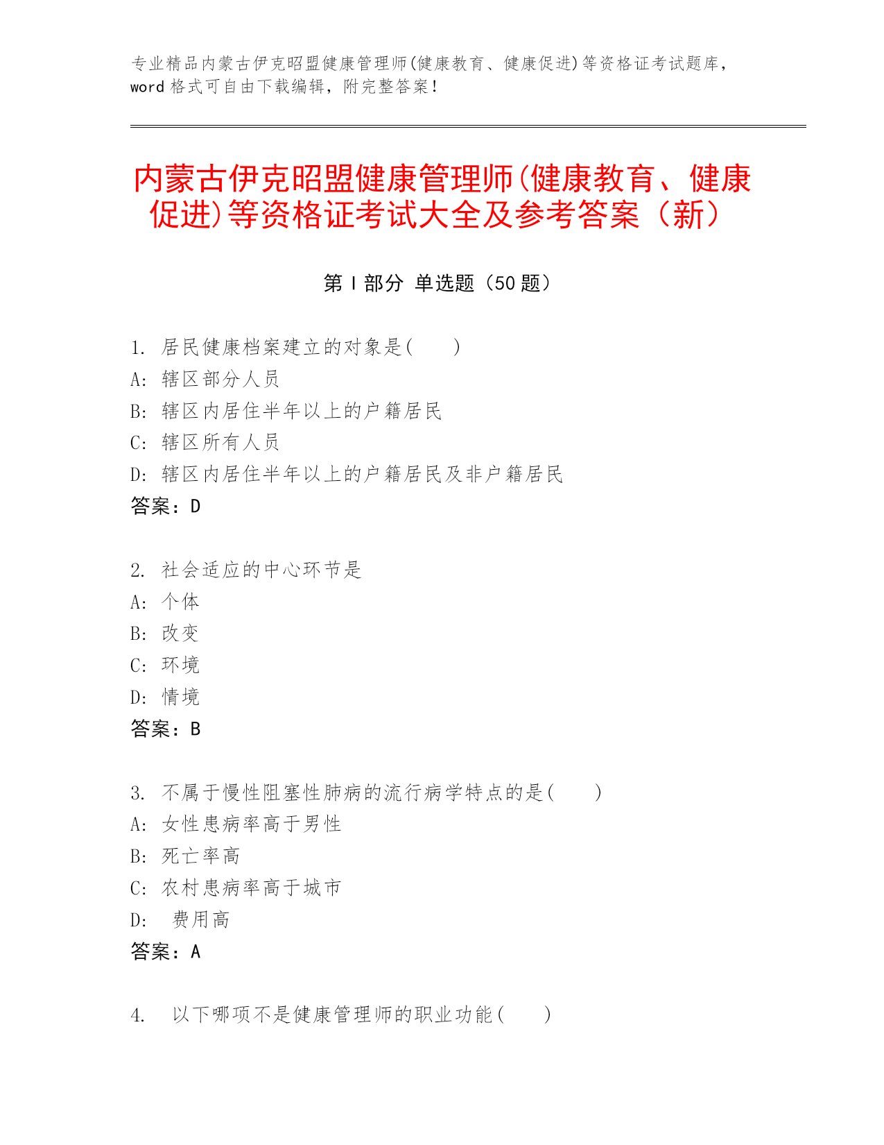 专业精品内蒙古伊克昭盟健康管理师(健康教育、健康促进)等资格证考试题库,word格式可自由下载编辑,附完整答案!内蒙古伊克昭盟健康管理师(健康教育、健康促进)等资格证考试大全及参考答案(新)第I部分单选题(50题)1.居民健康档案建立的对象是()A:辖区部分人员B:辖区内居住半年以上的户籍居民C:辖区所有人员D:辖区内居住半年以上的户籍居民及非户籍居民答案:D2.社会适应的中心环节是A:个体B:改变C:环境D:情境答案:B3.不属于慢性阻塞性肺病的流行病学特点的是()A:女性患病率高于男性B:死亡率高C: