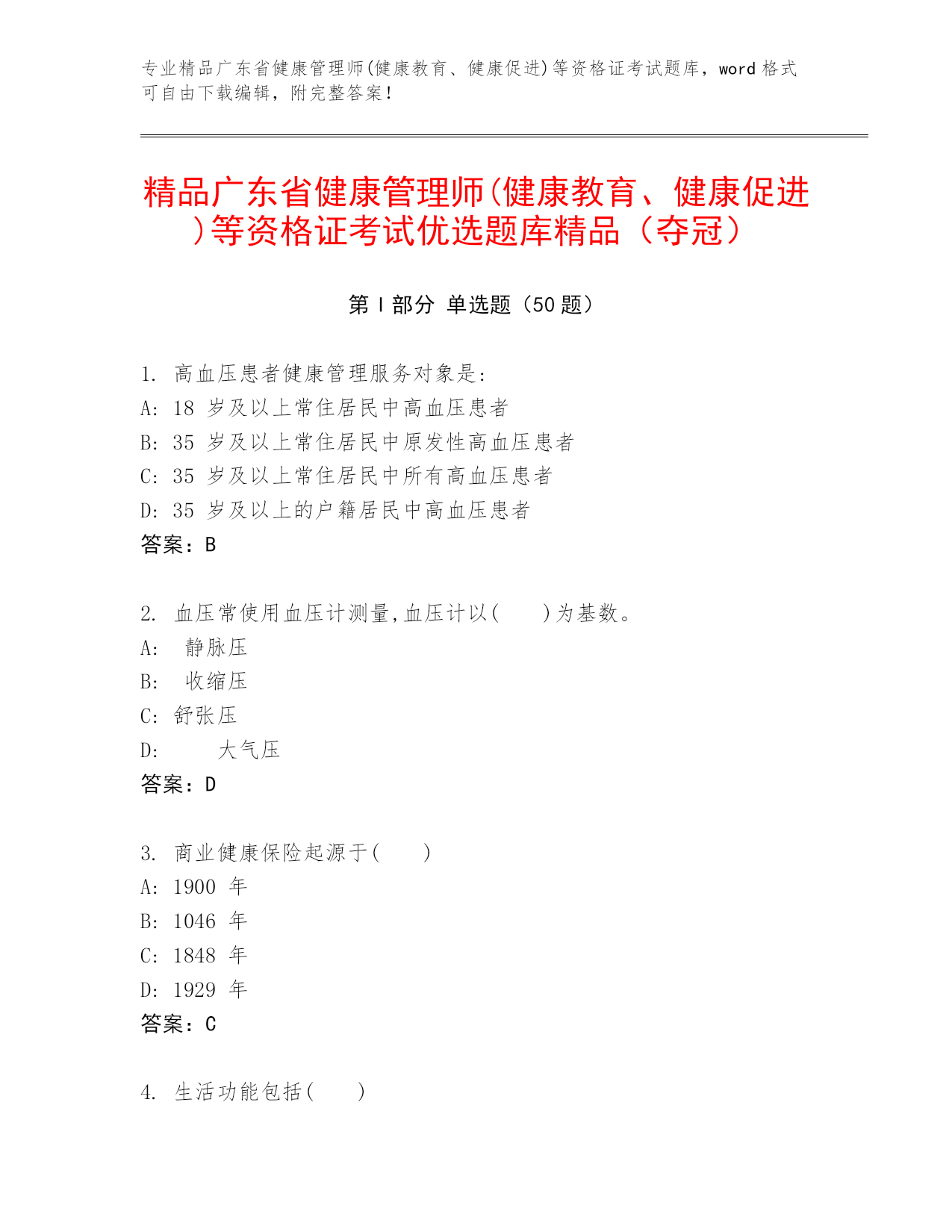 专业精品广东省健康管理师(健康教育、健康促进)等资格证考试题库,word格式可自由下载编辑,附完整答案!精品广东省健康管理师(健康教育、健康促进)等资格证考试优选题库精品(夺冠)第I部分单选题(50题)1.高血压患者健康管理服务对象是:A:18岁及以上常住居民中高血压患者B:35岁及以上常住居民中原发性高血压患者C:35岁及以上常住居民中所有高血压患者D:35岁及以上的户籍居民中高血压患者答案:B2.血压常使用血压计测量,血压计以()为基数。A:静脉压B:收缩压C:舒张压D:大气压答案:D3.商业健康保险