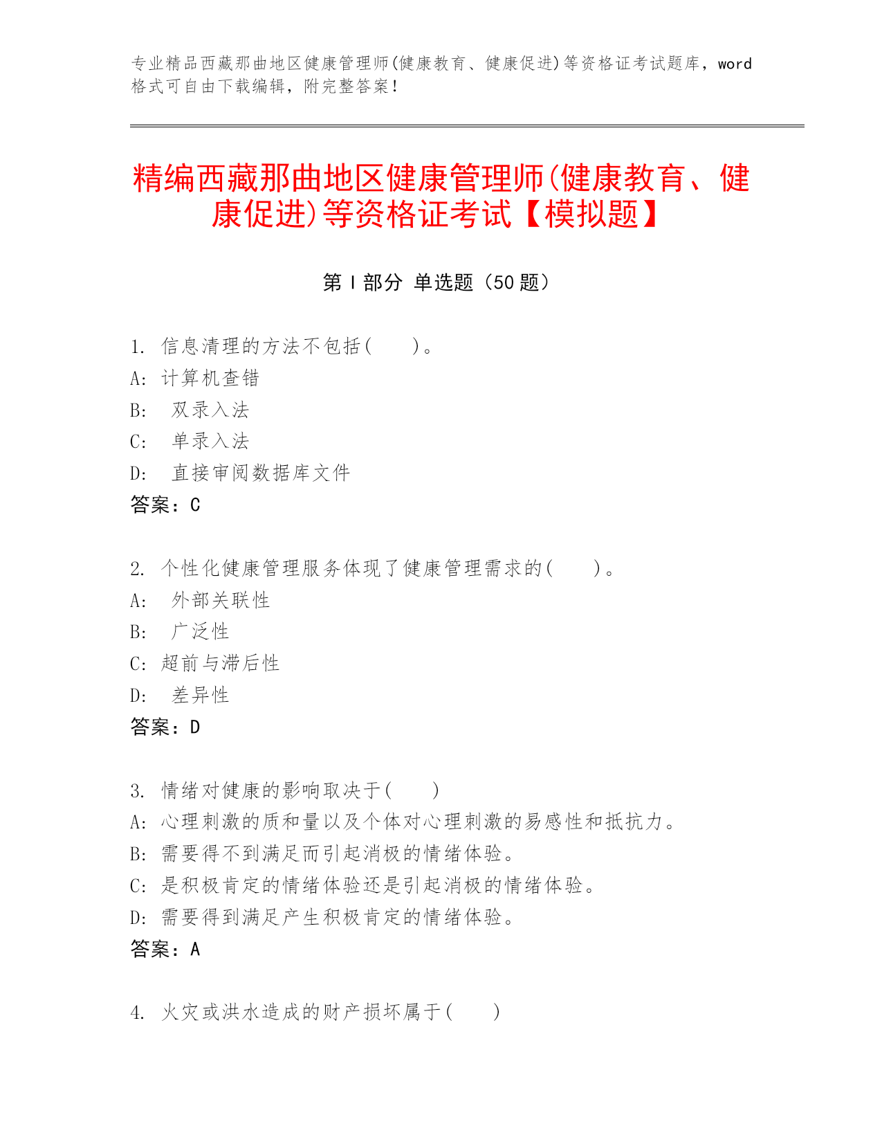 专业精品西藏那曲地区健康管理师(健康教育、健康促进)等资格证考试题库,word格式可自由下载编辑,附完整答案!精编西藏那曲地区健康管理师(健康教育、健康促进)等资格证考试【模拟题】第I部分单选题(50题)1.信息清理的方法不包括()。A:计算机查错B:双录入法C:单录入法D:直接审阅数据库文件答案:C2.个性化健康管理服务体现了健康管理需求的()。A:外部关联性B:广泛性C:超前与滞后性D:差异性答案:D3.情绪对健康的影响取决于()A:心理刺激的质和量以及个体对心理刺激的易感性和抵抗力。B:需要得不到满