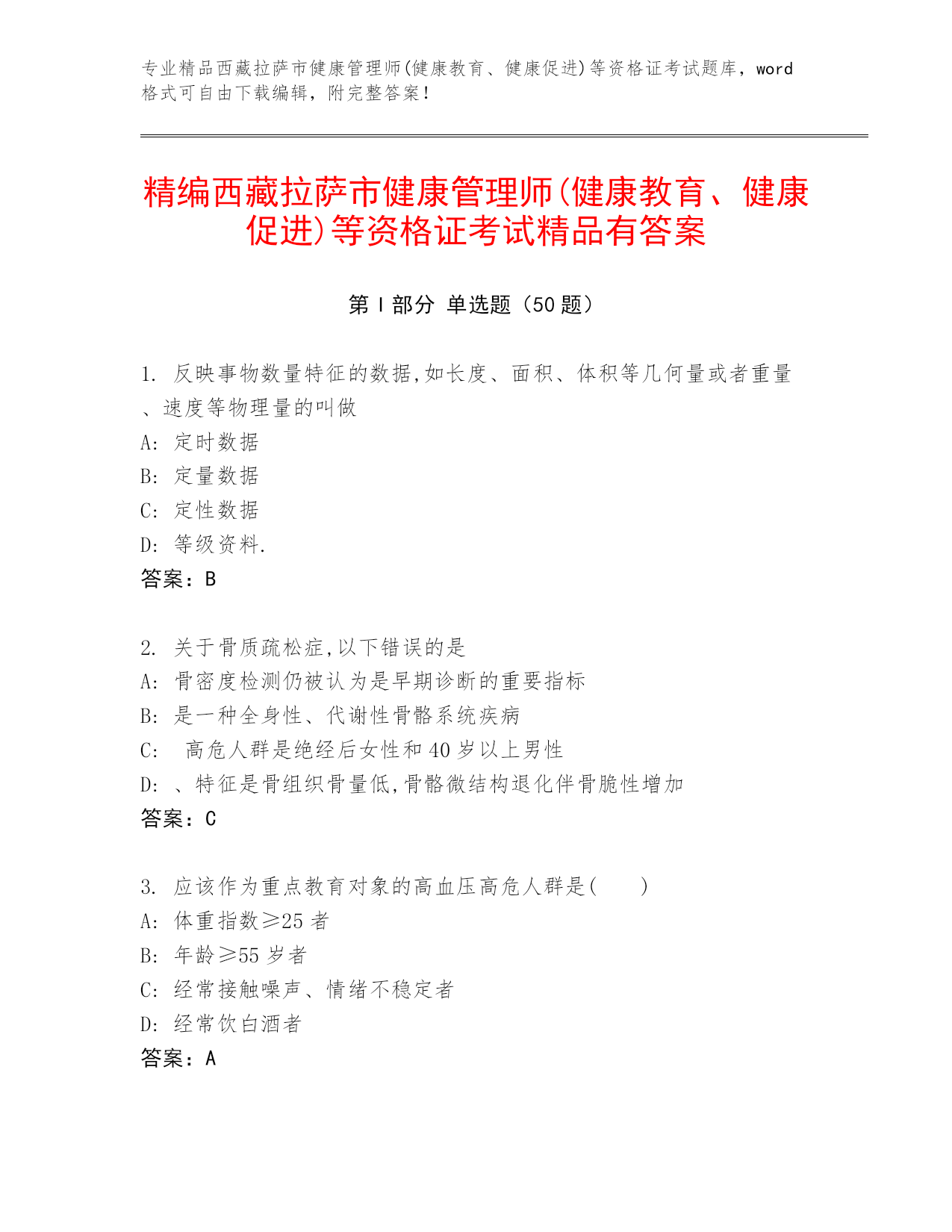 专业精品西藏拉萨市健康管理师(健康教育、健康促进)等资格证考试题库,word格式可自由下载编辑,附完整答案!精编西藏拉萨市健康管理师(健康教育、健康促进)等资格证考试精品有答案第I部分单选题(50题)1.反映事物数量特征的数据,如长度、面积、体积等几何量或者重量、速度等物理量的叫做A:定时数据B:定量数据C:定性数据D:等级资料.答案:B2.关于骨质疏松症,以下错误的是A:骨密度检测仍被认为是早期诊断的重要指标B:是一种全身性、代谢性骨骼系统疾病C:高危人群是绝经后女性和40岁以上男性D:、特征是骨组织骨
