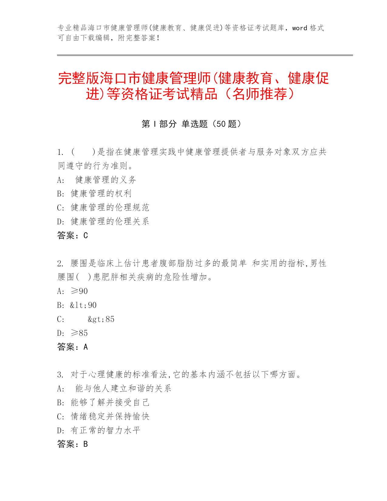 专业精品海口市健康管理师(健康教育、健康促进)等资格证考试题库,word格式可自由下载编辑,附完整答案!完整版海口市健康管理师(健康教育、健康促进)等资格证考试精品(名师推荐)第I部分单选题(50题)1.()是指在健康管理实践中健康管理提供者与服务对象双方应共同遵守的行为准则。A:健康管理的义务B:健康管理的权利C:健康管理的伦理规范D:健康管理的伦理关系答案:C2.腰围是临床上估计患者腹部脂肪过多的最简单和实用的指标,男性腰围()患肥胖相关疾病的危险性增加。A:≥90B:<90C:>85D: