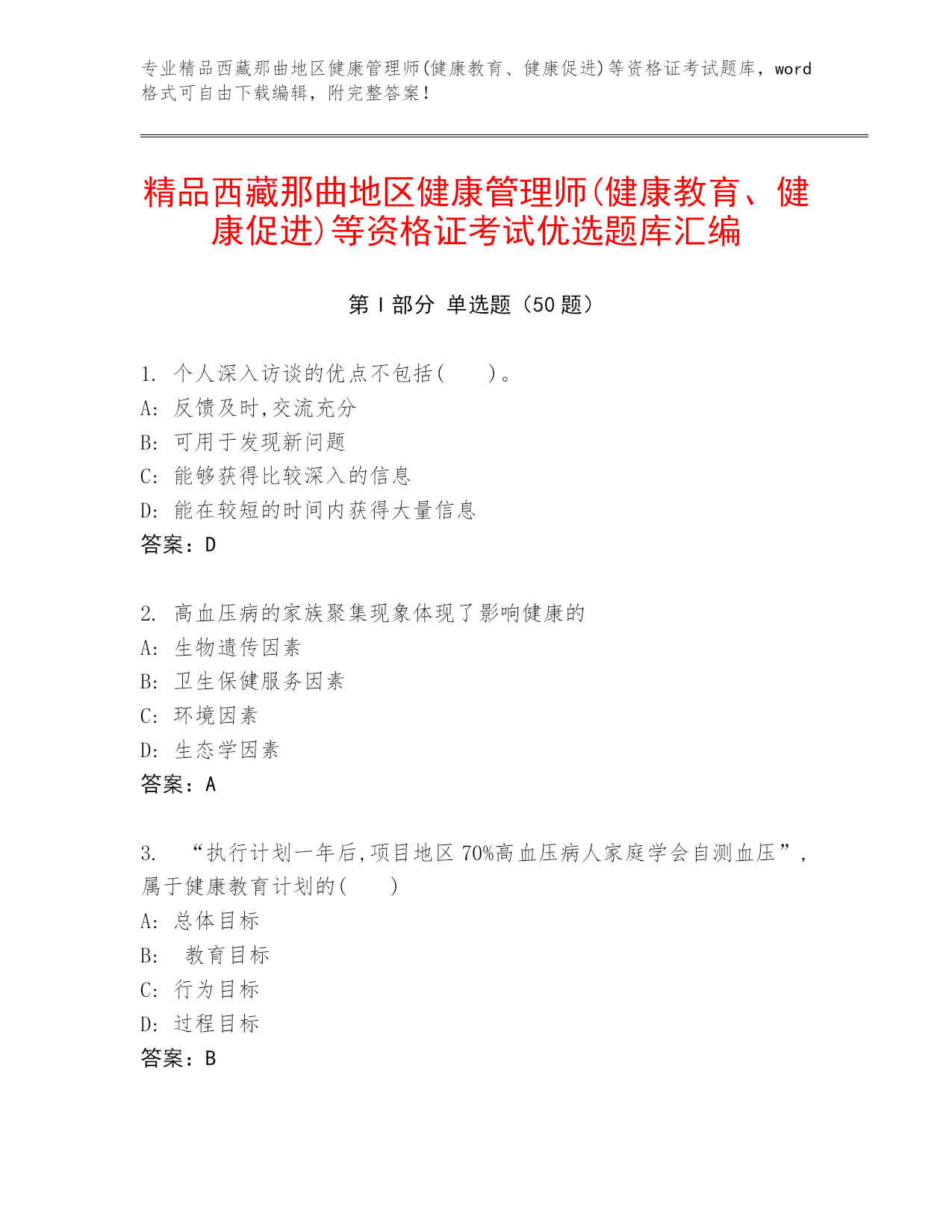 专业精品西藏那曲地区健康管理师(健康教育、健康促进)等资格证考试题库,word格式可自由下载编辑,附完整答案!精品西藏那曲地区健康管理师(健康教育、健康促进)等资格证考试优选题库汇编第I部分单选题(50题)1.个人深入访谈的优点不包括()。A:反馈及时,交流充分B:可用于发现新问题C:能够获得比较深入的信息D:能在较短的时间内获得大量信息答案:D2.高血压病的家族聚集现象体现了影响健康的A:生物遗传因素B:卫生保健服务因素C:环境因素D:生态学因素答案:A3.“执行计划一年后,项目地区70%高血压病人家庭