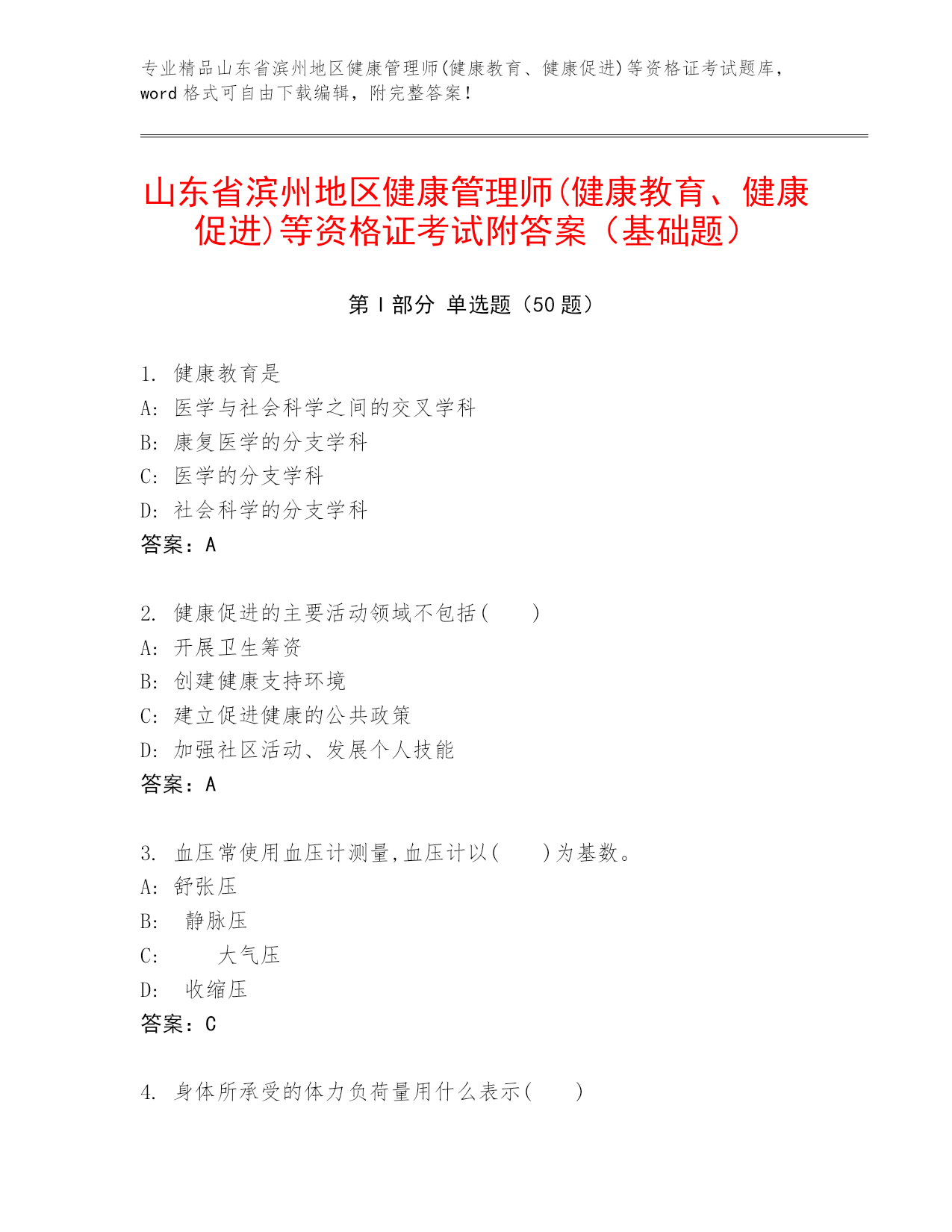 专业精品山东省滨州地区健康管理师(健康教育、健康促进)等资格证考试题库,word格式可自由下载编辑,附完整答案!山东省滨州地区健康管理师(健康教育、健康促进)等资格证考试附答案(基础题)第I部分单选题(50题)1.健康教育是A:医学与社会科学之间的交叉学科B:康复医学的分支学科C:医学的分支学科D:社会科学的分支学科答案:A2.健康促进的主要活动领域不包括()A:开展卫生筹资B:创建健康支持环境C:建立促进健康的公共政策D:加强社区活动、发展个人技能答案:A3.血压常使用血压计测量,血压计以()为基数。A