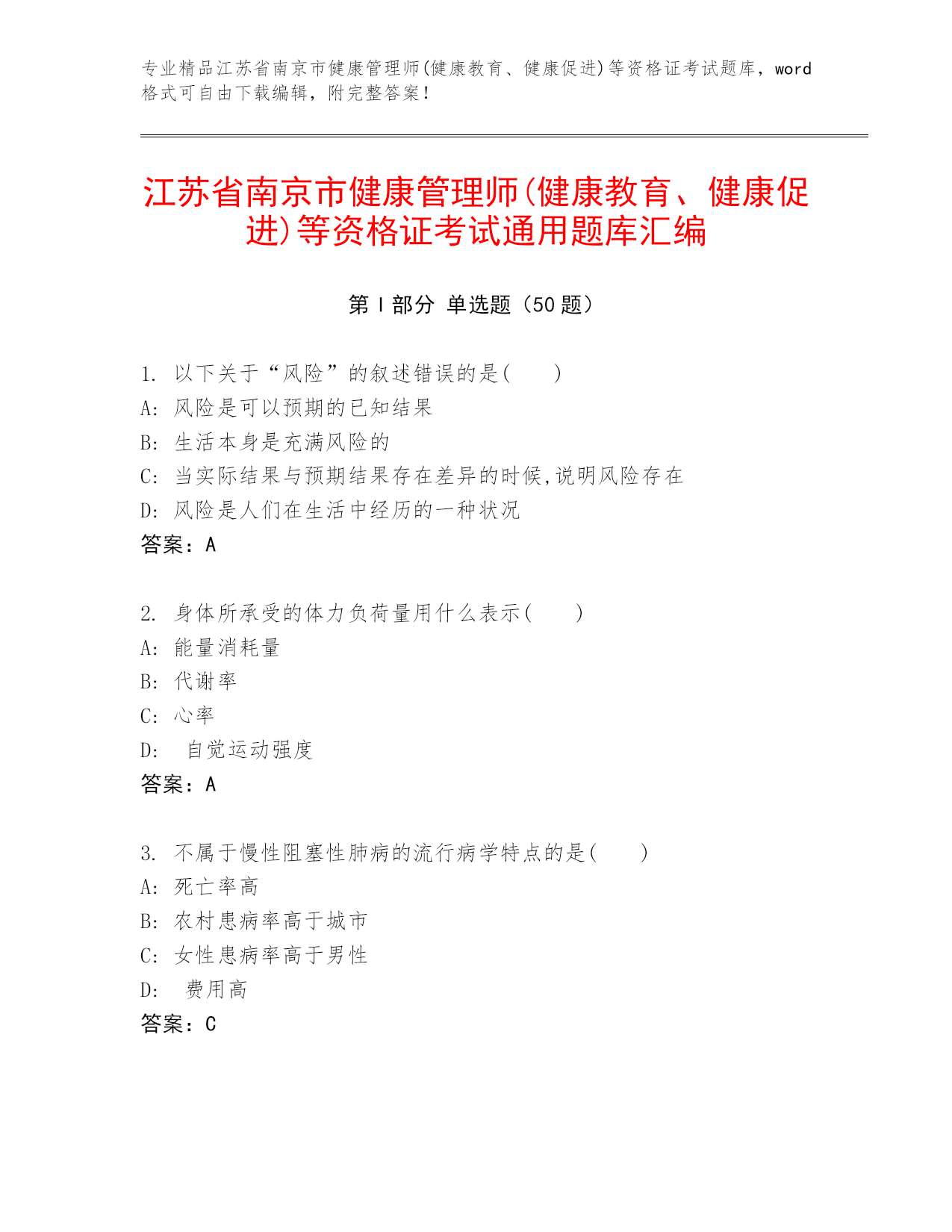 专业精品江苏省南京市健康管理师(健康教育、健康促进)等资格证考试题库,word格式可自由下载编辑,附完整答案!江苏省南京市健康管理师(健康教育、健康促进)等资格证考试通用题库汇编第I部分单选题(50题)1.以下关于“风险”的叙述错误的是()A:风险是可以预期的已知结果B:生活本身是充满风险的C:当实际结果与预期结果存在差异的时候,说明风险存在D:风险是人们在生活中经历的一种状况答案:A2.身体所承受的体力负荷量用什么表示()A:能量消耗量B:代谢率C:心率D:自觉运动强度答案:A3.不属于慢性阻塞性肺病的