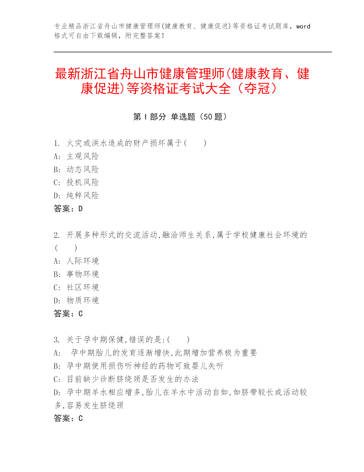 专业精品浙江省舟山市健康管理师(健康教育、健康促进)等资格证考试题库,word格式可自由下载编辑,附完整答案!最新浙江省舟山市健康管理师(健康教育、健康促进)等资格证考试大全(夺冠)第I部分单选题(50题)1.火灾或洪水造成的财产损坏属于()A:主观风险B:动态风险C:投机风险D:纯粹风险答案:D2.开展多种形式的交流活动,融洽师生关系,属于学校健康社会环境的()A:人际环境B:事物环境C:社区环境D:物质环境答案:C3.关于孕中期保健,错误的是:()A:孕中期胎儿的发育逐渐增快,此期增加营养极为重要B: