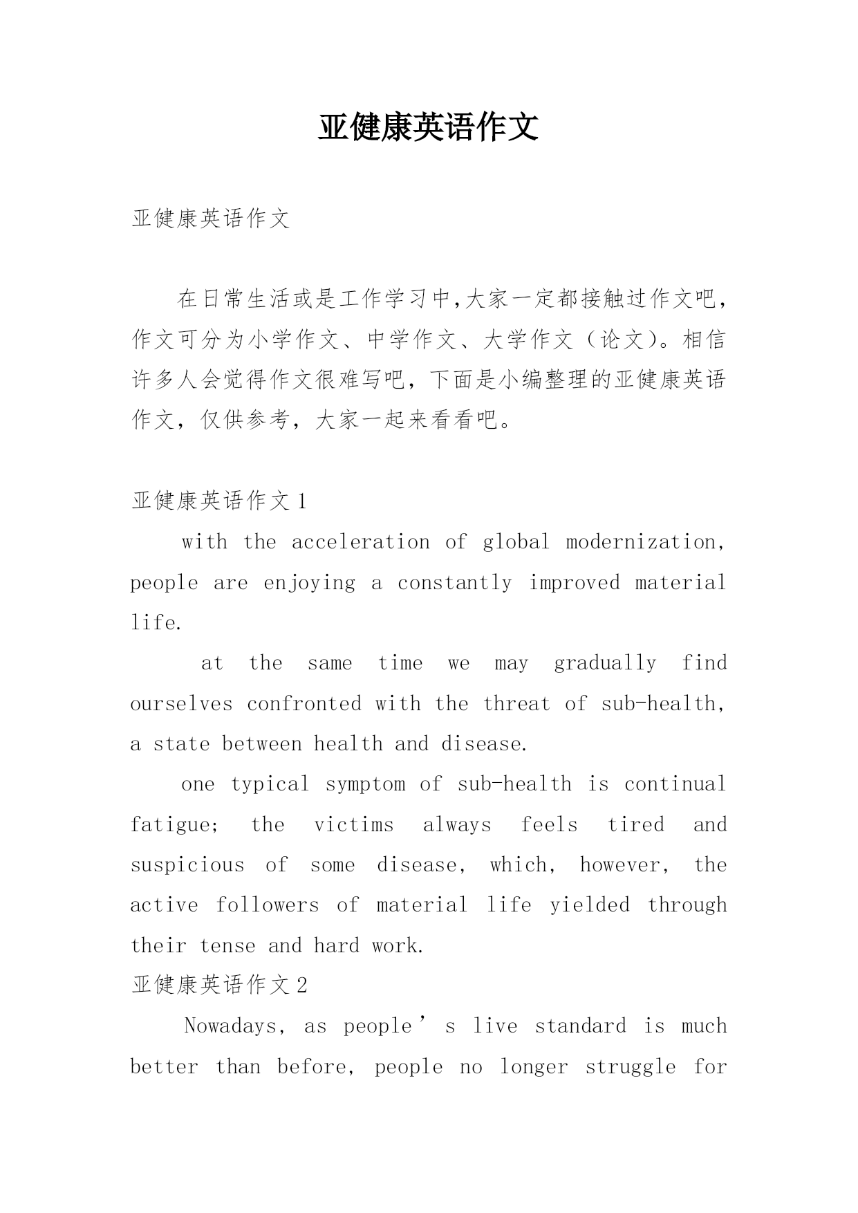 亚健康英语作文亚健康英语作文在日常生活或是工作学习中,大家一定都接触过作文吧,作文可分为小学作文、中学作文、大学作文(论文)。相信许多人会觉得作文很难写吧,下面是小编整理的亚健康英语作文,仅供参考,大家一起来看看吧。亚健康英语作文1withtheaccelerationofglobalmodernization,peopleareenjoyingaconstantlyimprovedmateriallife.atthesametimewemaygraduallyfindourselvesconfronte