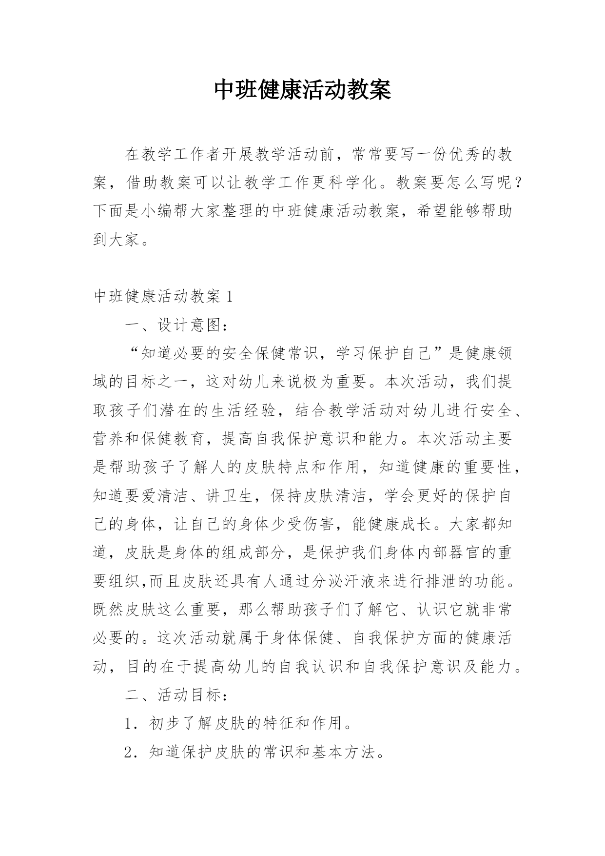 中班健康活动教案在教学工作者开展教学活动前,常常要写一份优秀的教案,借助教案可以让教学工作更科学化。教案要怎么写呢?下面是小编帮大家整理的中班健康活动教案,希望能够帮助到大家。中班健康活动教案1一、设计意图:“知道必要的安全保健常识,学习保护自己”是健康领域的目标之一,这对幼儿来说极为重要。本次活动,我们提取孩子们潜在的生活经验,结合教学活动对幼儿进行安全、营养和保健教育,提高自我保护意识和能力。本次活动主要是帮助孩子了解人的皮肤特点和作用,知道健康的重要性,知道要爱清洁、讲卫生,保持皮肤清洁,学会更好的
