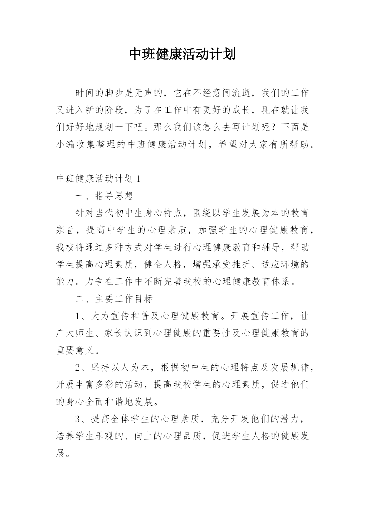 中班健康活动计划时间的脚步是无声的,它在不经意间流逝,我们的工作又进入新的阶段,为了在工作中有更好的成长,现在就让我们好好地规划一下吧。那么我们该怎么去写计划呢?下面是小编收集整理的中班健康活动计划,希望对大家有所帮助。中班健康活动计划1一、指导思想针对当代初中生身心特点,围绕以学生发展为本的教育宗旨,提高中学生的心理素质,加强学生的心理健康教育,我校将通过多种方式对学生进行心理健康教育和辅导,帮助学生提高心理素质,健全人格,增强承受挫折、适应环境的能力。力争在工作中不断完善我校的心理健康教育体系。二、主