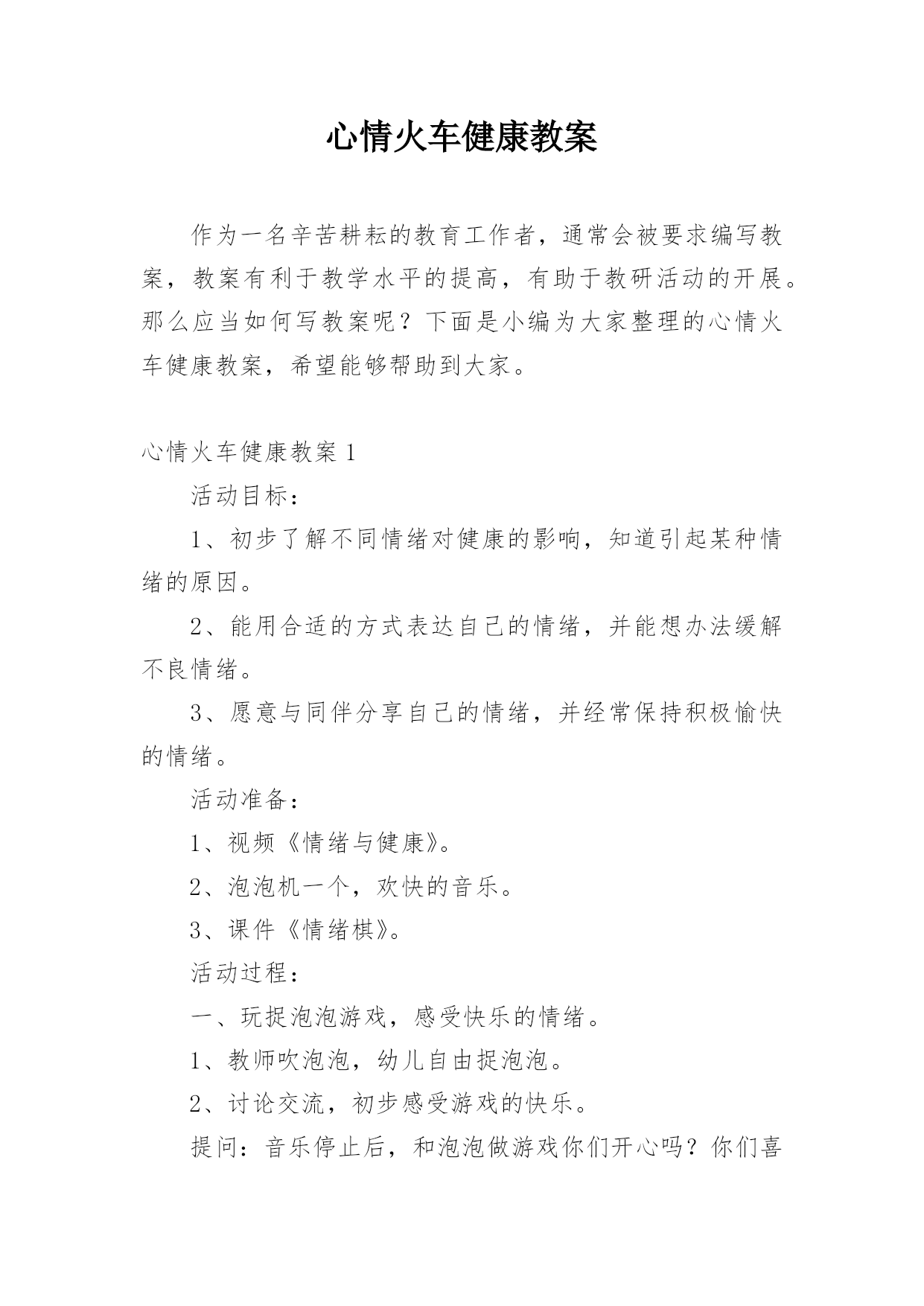 心情火车健康教案作为一名辛苦耕耘的教育工作者,通常会被要求编写教案,教案有利于教学水平的提高,有助于教研活动的开展。那么应当如何写教案呢?下面是小编为大家整理的心情火车健康教案,希望能够帮助到大家。心情火车健康教案1活动目标:1、初步了解不同情绪对健康的影响,知道引起某种情绪的原因。2、能用合适的方式表达自己的情绪,并能想办法缓解不良情绪。3、愿意与同伴分享自己的情绪,并经常保持积极愉快的情绪。活动准备:1、视频《情绪与健康》。2、泡泡机一个,欢快的音乐。3、课件《情绪棋》。活动过程:一、玩捉泡泡游戏,感