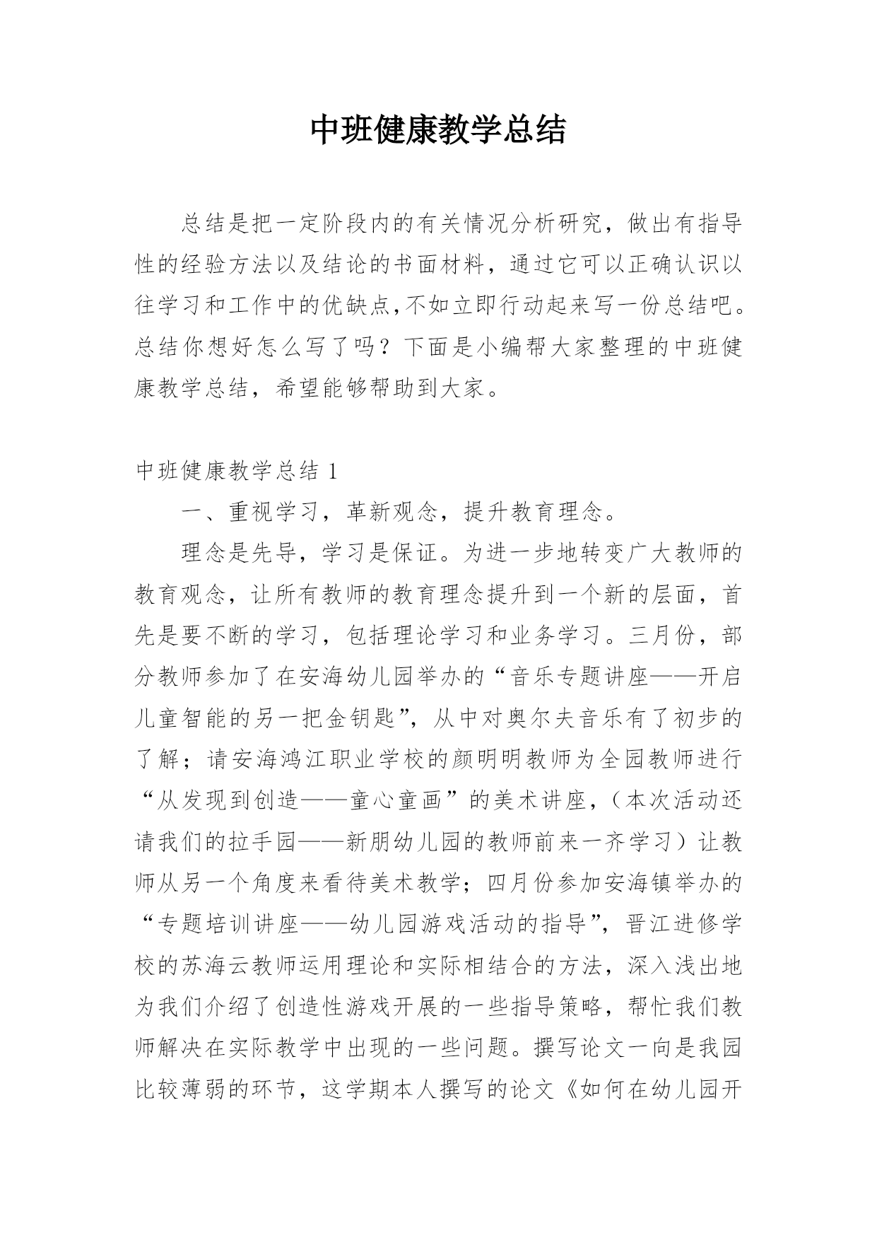 中班健康教学总结总结是把一定阶段内的有关情况分析研究,做出有指导性的经验方法以及结论的书面材料,通过它可以正确认识以往学习和工作中的优缺点,不如立即行动起来写一份总结吧。总结你想好怎么写了吗?下面是小编帮大家整理的中班健康教学总结,希望能够帮助到大家。中班健康教学总结1一、重视学习,革新观念,提升教育理念。理念是先导,学习是保证。为进一步地转变广大教师的教育观念,让所有教师的教育理念提升到一个新的层面,首先是要不断的学习,包括理论学习和业务学习。三月份,部分教师参加了在安海幼儿园举办的“音乐专题讲座——开