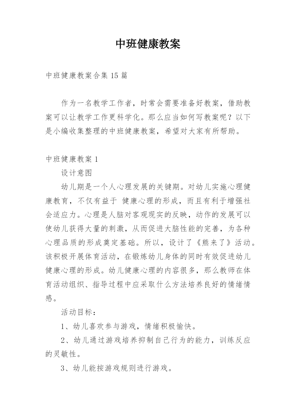 中班健康教案中班健康教案合集15篇作为一名教学工作者,时常会需要准备好教案,借助教案可以让教学工作更科学化。那么应当如何写教案呢?以下是小编收集整理的中班健康教案,希望对大家有所帮助。中班健康教案1设计意图幼儿期是一个人心理发展的关键期。对幼儿实施心理健康教育,不仅有益于健康心理的形成,而且有利于增强社会适应力。心理是人脑对客观现实的反映,动作的发展可以使幼儿获得大量的刺激,从而促进大脑性能的完善,为各种心理品质的形成奠定基础。所以,设计了《熊来了》活动。该积极开展体育活动,在锻炼幼儿身体的同时有效促进幼