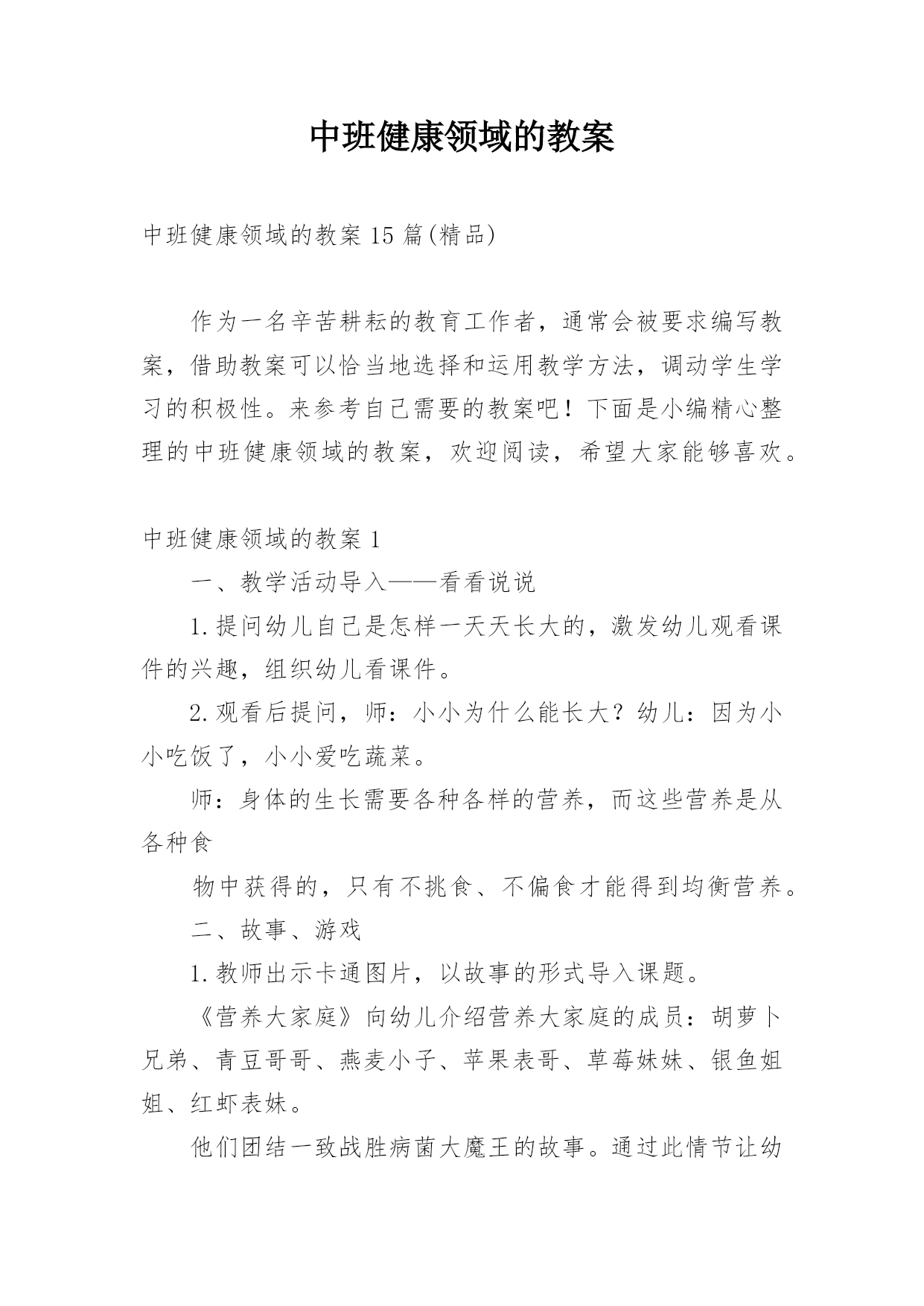 中班健康领域的教案中班健康领域的教案15篇(精品)作为一名辛苦耕耘的教育工作者,通常会被要求编写教案,借助教案可以恰当地选择和运用教学方法,调动学生学习的积极性。来参考自己需要的教案吧!下面是小编精心整理的中班健康领域的教案,欢迎阅读,希望大家能够喜欢。中班健康领域的教案1一、教学活动导入——看看说说1.提问幼儿自己是怎样一天天长大的,激发幼儿观看课件的兴趣,组织幼儿看课件。2.观看后提问,师:小小为什么能长大?幼儿:因为小小吃饭了,小小爱吃蔬菜。师:身体的生长需要各种各样的营养,而这些营养是从各种食物中