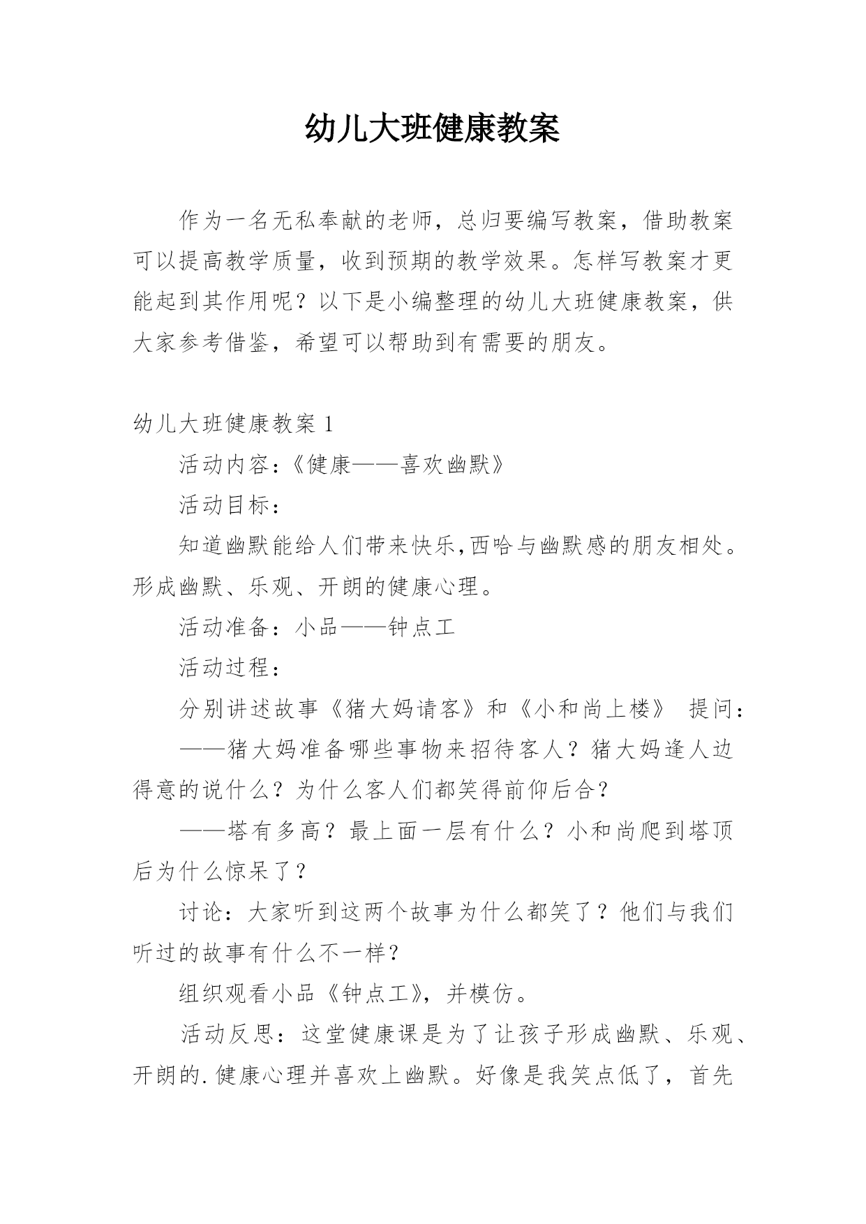 幼儿大班健康教案作为一名无私奉献的老师,总归要编写教案,借助教案可以提高教学质量,收到预期的教学效果。怎样写教案才更能起到其作用呢?以下是小编整理的幼儿大班健康教案,供大家参考借鉴,希望可以帮助到有需要的朋友。幼儿大班健康教案1活动内容:《健康——喜欢幽默》活动目标:知道幽默能给人们带来快乐,西哈与幽默感的朋友相处。形成幽默、乐观、开朗的健康心理。活动准备:小品——钟点工活动过程:分别讲述故事《猪大妈请客》和《小和尚上楼》提问:——猪大妈准备哪些事物来招待客人?猪大妈逢人边得意的说什么?为什么客人们都笑得