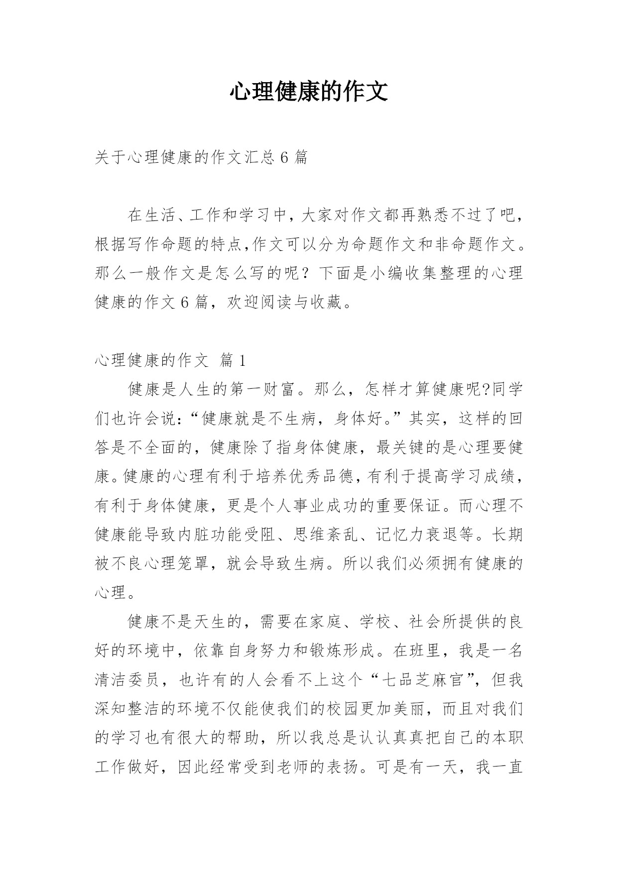 心理健康的作文关于心理健康的作文汇总6篇在生活、工作和学习中,大家对作文都再熟悉不过了吧,根据写作命题的特点,作文可以分为命题作文和非命题作文。那么一般作文是怎么写的呢?下面是小编收集整理的心理健康的作文6篇,欢迎阅读与收藏。心理健康的作文篇1健康是人生的第一财富。那么,怎样才算健康呢?同学们也许会说:“健康就是不生病,身体好。”其实,这样的回答是不全面的,健康除了指身体健康,最关键的是心理要健康。健康的心理有利于培养优秀品德,有利于提高学习成绩,有利于身体健康,更是个人事业成功的重要保证。而心理不健康能