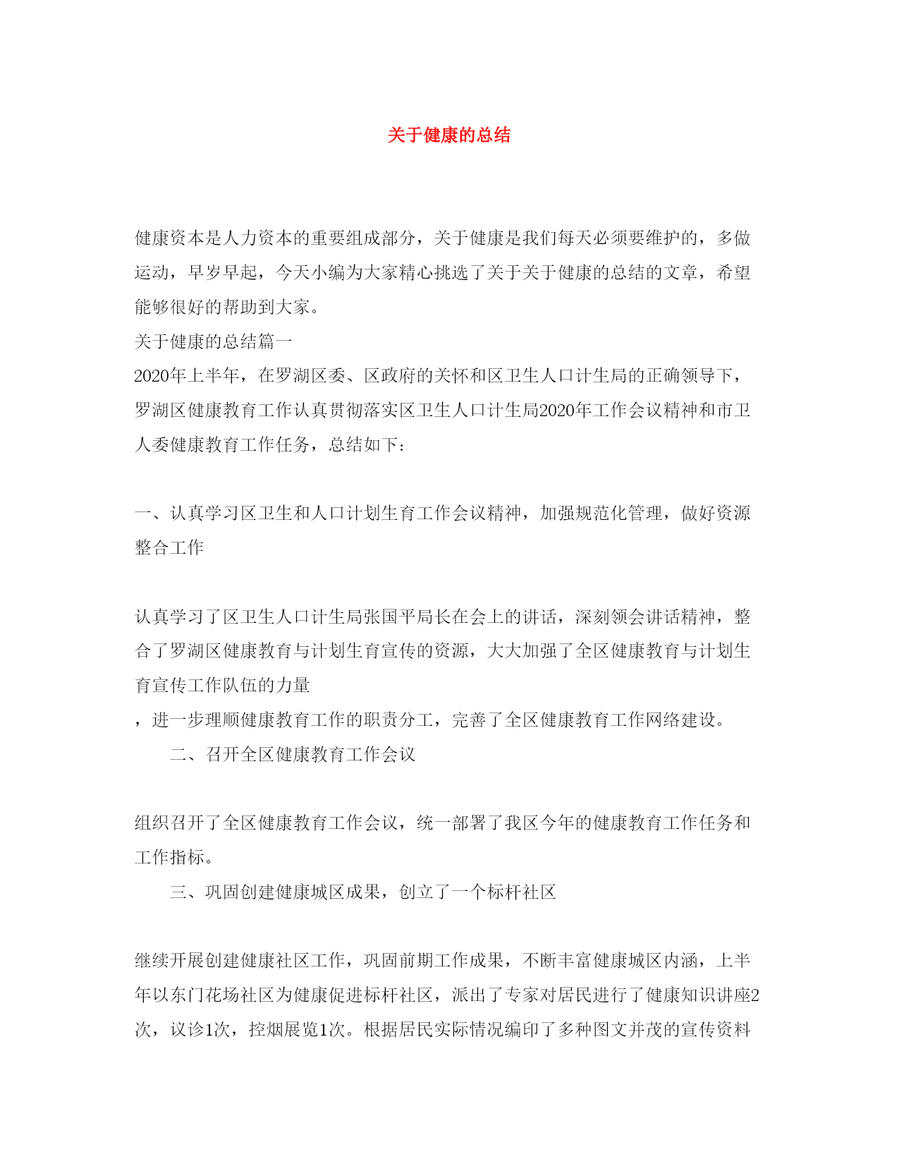 此资料由网络收集而来,如有侵权请告知上传者立即删除。资料共分享,我们负责传递知识。关于健康的总结健康资本是人力资本的重要组成部分,关于健康是我们每天必须要维护的,多做运动,早岁早起,今天小编为大家精心挑选了关于关于健康的总结的文章,希望能够很好的帮助到大家。关于健康的总结篇一2020年上半年,在罗湖区委、区政府的关怀和区卫生人口计生局的正确领导下,罗湖区健康教育工作认真贯彻落实区卫生人口计生局2020年工作会议精神和市卫人委健康教育工作任务,总结如下:一、认真学习区卫生和人口计划生育工作会议精神,加强规范