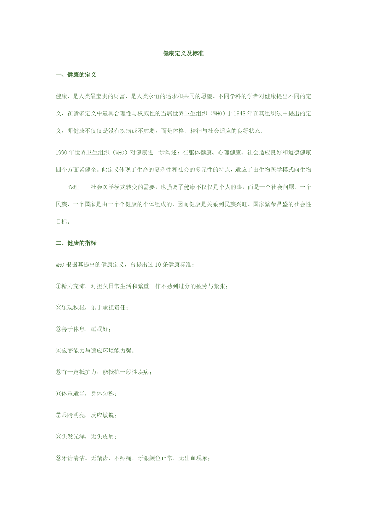 健康定义及标准一、健康的定义健康,是人类最宝贵的财富,是人类永恒的追求和共同的愿望。不同学科的学者对健康提出不同的定义,在诸多定义中最具合理性与权威性的当属世界卫生组织(WHO)于1948年在其组织法中提出的定义,即健康不仅仅是没有疾病或不虚弱,而是体格、精神与社会适应的良好状态。1990年世界卫生组织(WHO)对健康进一步阐述:在躯体健康、心理健康、社会适应良好和道德健康四个方面皆健全。此定义体现了生命的复杂性和社会的多元性的特点,适应了由生物医学模式向生物——心理——社会医学模式转变的需要,也强调了健