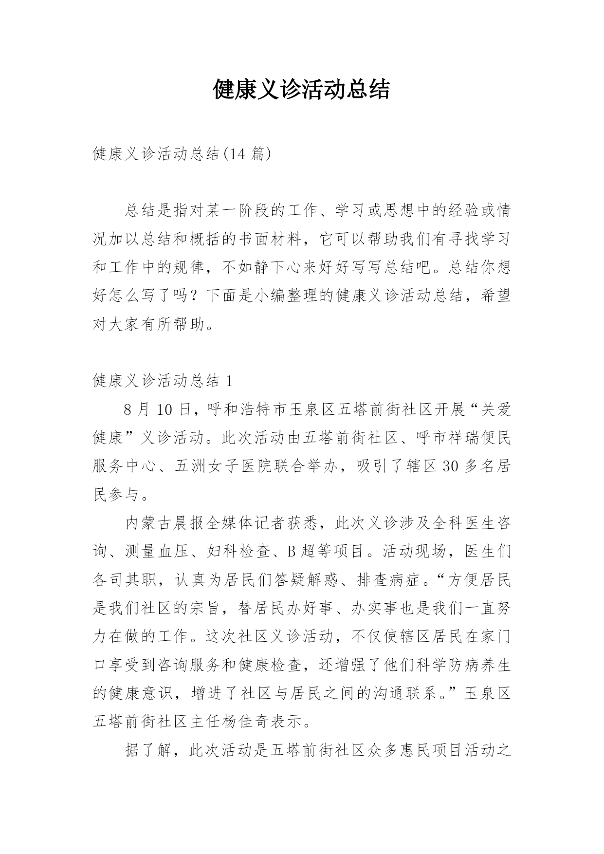 健康义诊活动总结健康义诊活动总结(14篇)总结是指对某一阶段的工作、学习或思想中的经验或情况加以总结和概括的书面材料,它可以帮助我们有寻找学习和工作中的规律,不如静下心来好好写写总结吧。总结你想好怎么写了吗?下面是小编整理的健康义诊活动总结,希望对大家有所帮助。健康义诊活动总结18月10日,呼和浩特市玉泉区五塔前街社区开展“关爱健康”义诊活动。此次活动由五塔前街社区、呼市祥瑞便民服务中心、五洲女子医院联合举办,吸引了辖区30多名居民参与。内蒙古晨报全媒体记者获悉,此次义诊涉及全科医生咨询、测量血压、妇科检