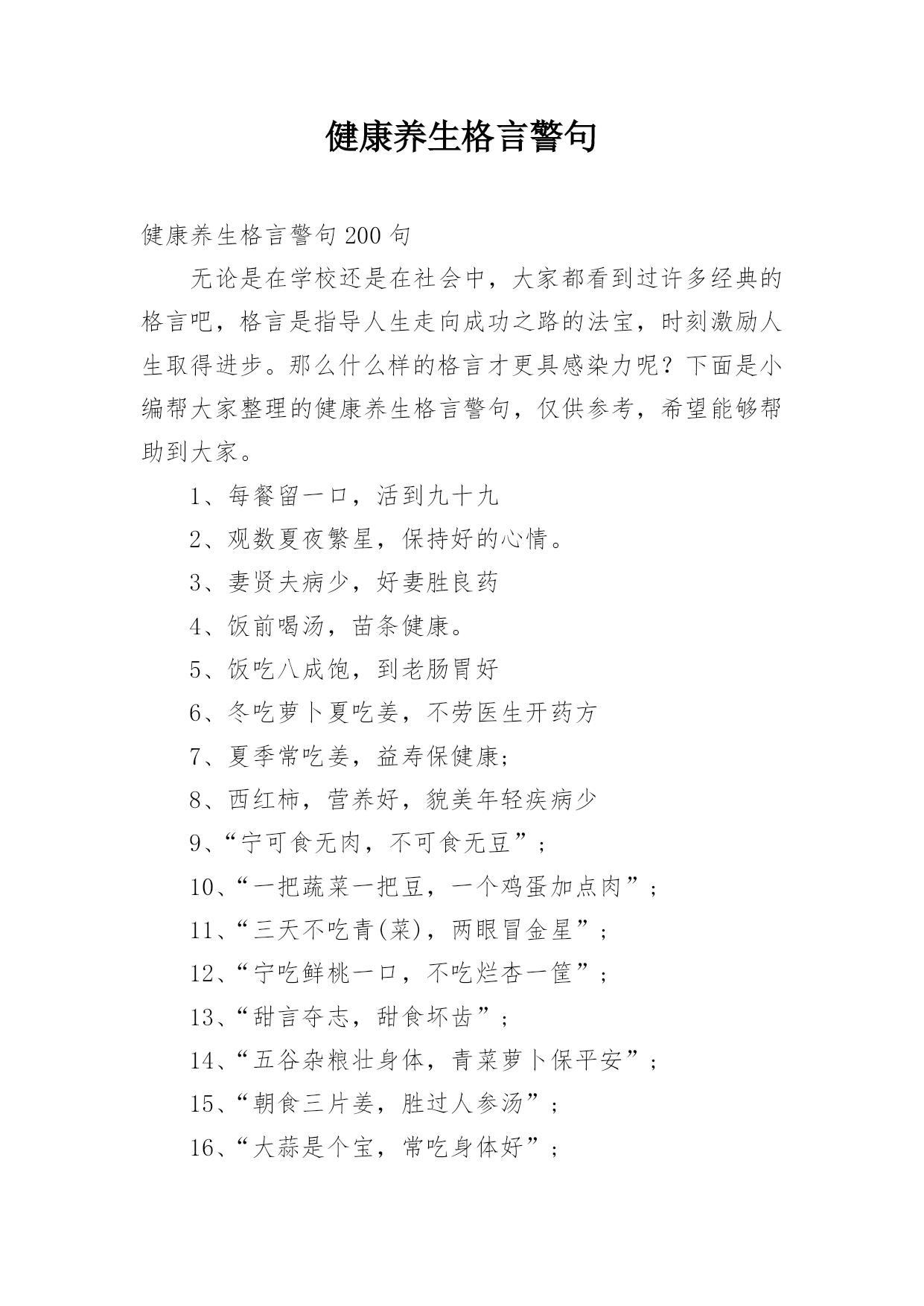 健康养生格言警句健康养生格言警句200句无论是在学校还是在社会中,大家都看到过许多经典的格言吧,格言是指导人生走向成功之路的法宝,时刻激励人生取得进步。那么什么样的格言才更具感染力呢?下面是小编帮大家整理的健康养生格言警句,仅供参考,希望能够帮助到大家。1、每餐留一口,活到九十九2、观数夏夜繁星,保持好的心情。3、妻贤夫病少,好妻胜良药4、饭前喝汤,苗条健康。5、饭吃八成饱,到老肠胃好6、冬吃萝卜夏吃姜,不劳医生开药方7、夏季常吃姜,益寿保健康;8、西红柿,营养好,貌美年轻疾病少9、“宁可食无肉,不可食无