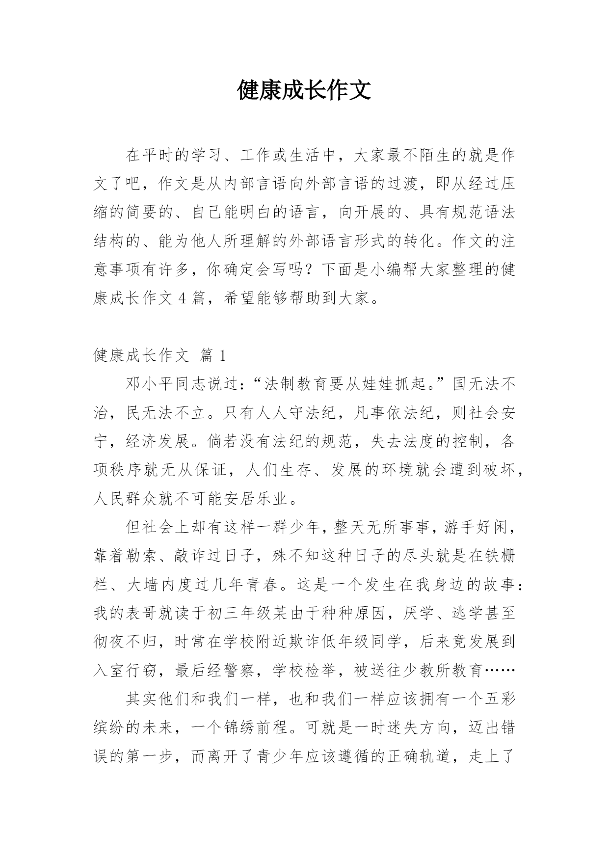 健康成长作文在平时的学习、工作或生活中,大家最不陌生的就是作文了吧,作文是从内部言语向外部言语的过渡,即从经过压缩的简要的、自己能明白的语言,向开展的、具有规范语法结构的、能为他人所理解的外部语言形式的转化。作文的注意事项有许多,你确定会写吗?下面是小编帮大家整理的健康成长作文4篇,希望能够帮助到大家。健康成长作文篇1邓小平同志说过:“法制教育要从娃娃抓起。”国无法不治,民无法不立。只有人人守法纪,凡事依法纪,则社会安宁,经济发展。倘若没有法纪的规范,失去法度的控制,各项秩序就无从保证,人们生存、发展的环