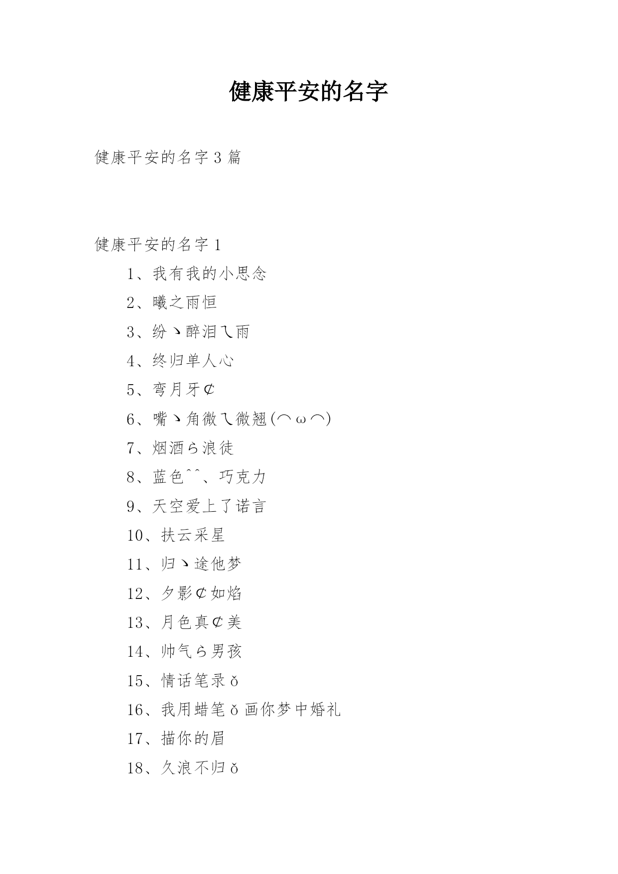 健康平安的名字健康平安的名字3篇健康平安的名字11、我有我的小思念2、曦之雨恒3、纷ゝ醉泪ㄟ雨4、终归单人心5、弯月牙¢6、嘴ゝ角微ㄟ微翘(⌒ω⌒)7、烟酒ら浪徒8、蓝色^^、巧克力9、天空爱上了诺言10、扶云采星11、归ゝ途他梦12、夕影¢如焰13、月色真¢美14、帅气ら男孩15、情话笔录ǒ16、我用蜡笔ǒ画你梦中婚礼17、描你的眉18、久浪不归ǒ19、浮ゝ生半梦20、一生ら一世21、无┈┾名指的等待22、花香百合23、鱼在水︵里哭24、踮脚亲¢你25、青衫ら落拓26、笙歌初寒27、长情ら♂28、久旧揪