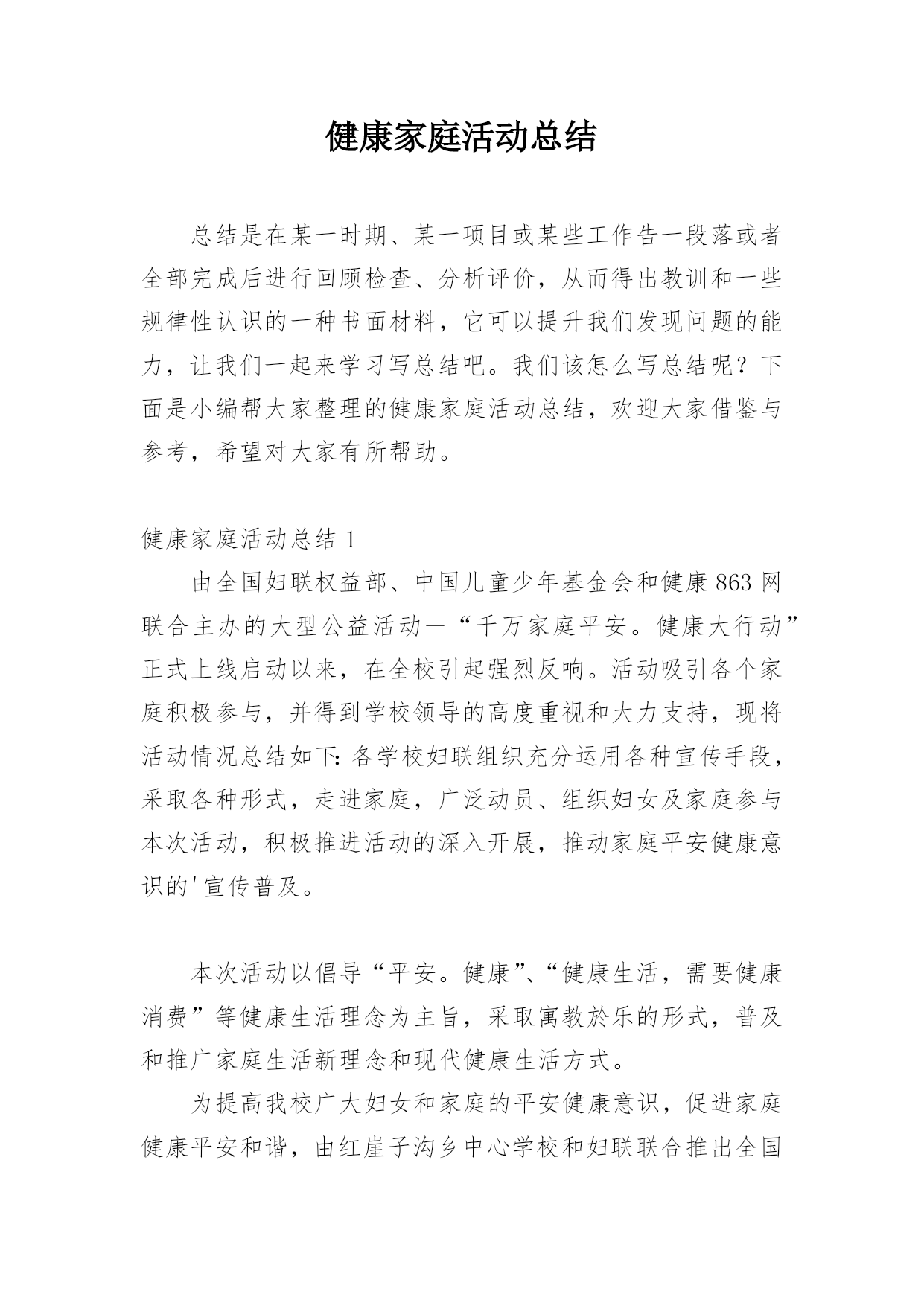 健康家庭活动总结总结是在某一时期、某一项目或某些工作告一段落或者全部完成后进行回顾检查、分析评价,从而得出教训和一些规律性认识的一种书面材料,它可以提升我们发现问题的能力,让我们一起来学习写总结吧。我们该怎么写总结呢?下面是小编帮大家整理的健康家庭活动总结,欢迎大家借鉴与参考,希望对大家有所帮助。健康家庭活动总结1由全国妇联权益部、中国儿童少年基金会和健康863网联合主办的大型公益活动-“千万家庭平安。健康大行动”正式上线启动以来,在全校引起强烈反响。活动吸引各个家庭积极参与,并得到学校领导的高度重视和大