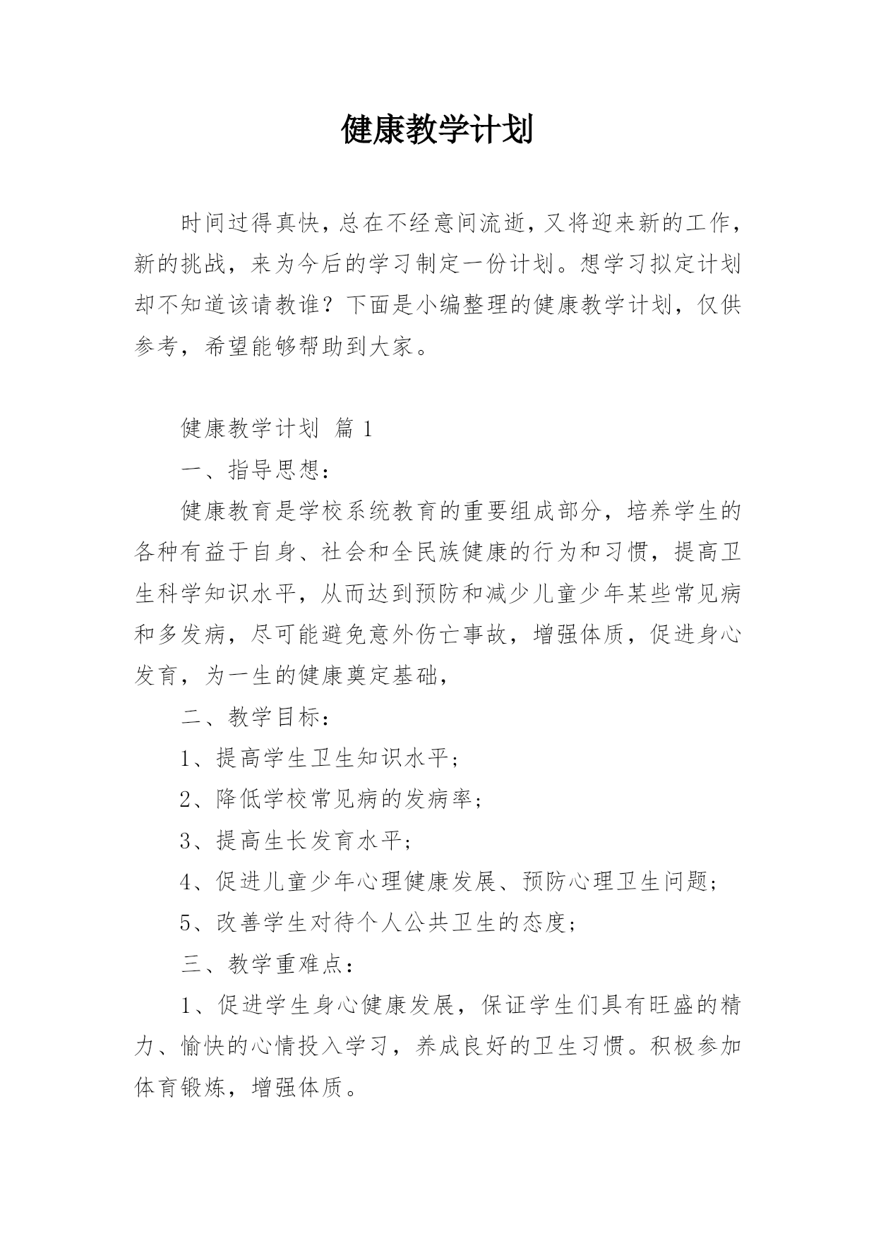 健康教学计划时间过得真快,总在不经意间流逝,又将迎来新的工作,新的挑战,来为今后的学习制定一份计划。想学习拟定计划却不知道该请教谁?下面是小编整理的健康教学计划,仅供参考,希望能够帮助到大家。健康教学计划篇1一、指导思想:健康教育是学校系统教育的重要组成部分,培养学生的各种有益于自身、社会和全民族健康的行为和习惯,提高卫生科学知识水平,从而达到预防和减少儿童少年某些常见病和多发病,尽可能避免意外伤亡事故,增强体质,促进身心发育,为一生的健康奠定基础,二、教学目标:1、提高学生卫生知识水平;2、降低学校常见