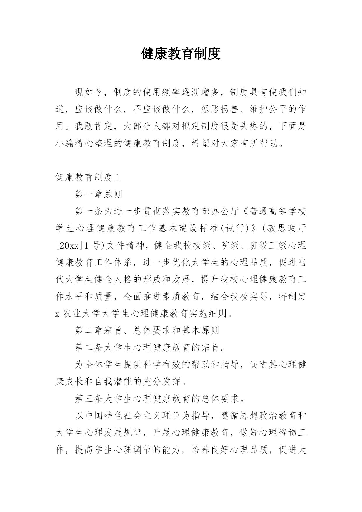 健康教育制度现如今,制度的使用频率逐渐增多,制度具有使我们知道,应该做什么,不应该做什么,惩恶扬善、维护公平的作用。我敢肯定,大部分人都对拟定制度很是头疼的,下面是小编精心整理的健康教育制度,希望对大家有所帮助。健康教育制度1第一章总则第一条为进一步贯彻落实教育部办公厅《普通高等学校学生心理健康教育工作基本建设标准(试行)》(教思政厅[20xx]1号)文件精神,健全我校校级、院级、班级三级心理健康教育工作体系,进一步优化大学生的心理品质,促进当代大学生健全人格的形成和发展,提升我校心理健康教育工作水平和质