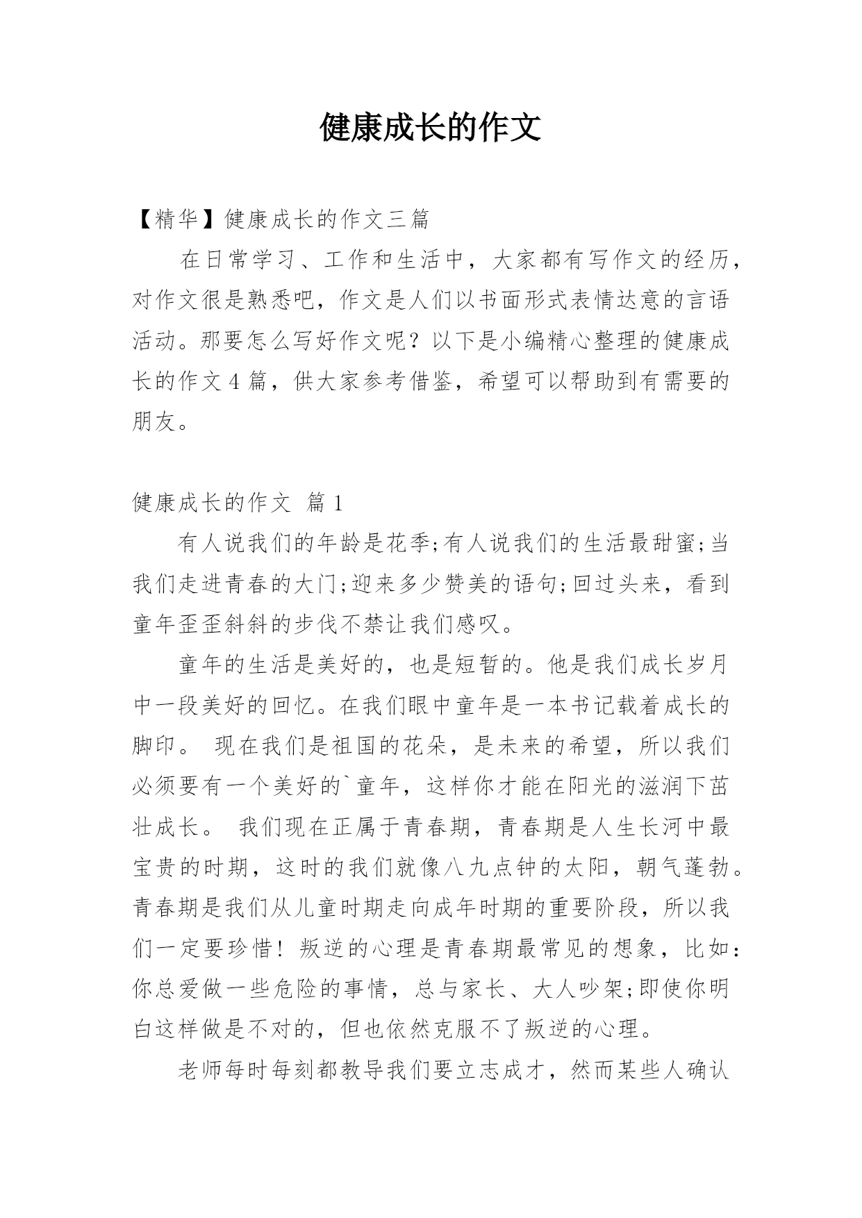 健康成长的作文【精华】健康成长的作文三篇在日常学习、工作和生活中,大家都有写作文的经历,对作文很是熟悉吧,作文是人们以书面形式表情达意的言语活动。那要怎么写好作文呢?以下是小编精心整理的健康成长的作文4篇,供大家参考借鉴,希望可以帮助到有需要的朋友。健康成长的作文篇1有人说我们的年龄是花季;有人说我们的生活最甜蜜;当我们走进青春的大门;迎来多少赞美的语句;回过头来,看到童年歪歪斜斜的步伐不禁让我们感叹。童年的生活是美好的,也是短暂的。他是我们成长岁月中一段美好的回忆。在我们眼中童年是一本书记载着成长的脚印