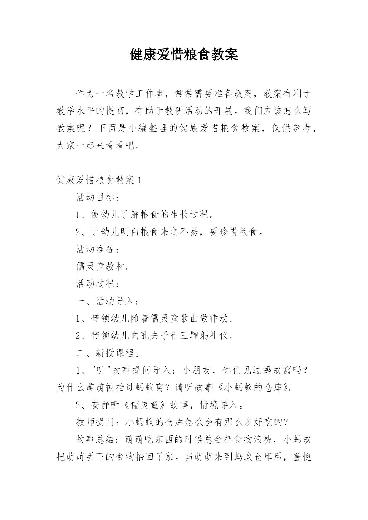 健康爱惜粮食教案作为一名教学工作者,常常需要准备教案,教案有利于教学水平的提高,有助于教研活动的开展。我们应该怎么写教案呢?下面是小编整理的健康爱惜粮食教案,仅供参考,大家一起来看看吧。健康爱惜粮食教案1活动目标:1、使幼儿了解粮食的生长过程。2、让幼儿明白粮食来之不易,要珍惜粮食。活动准备:儒灵童教材。活动过程:一、活动导入:1、带领幼儿随着儒灵童歌曲做律动。2、带领幼儿向孔夫子行三鞠躬礼仪。二、新授课程。1、"听"故事提问导入:小朋友,你们见过蚂蚁窝吗?为什么萌萌被抬进蚂蚁窝?请听故事《小蚂蚁的仓库》