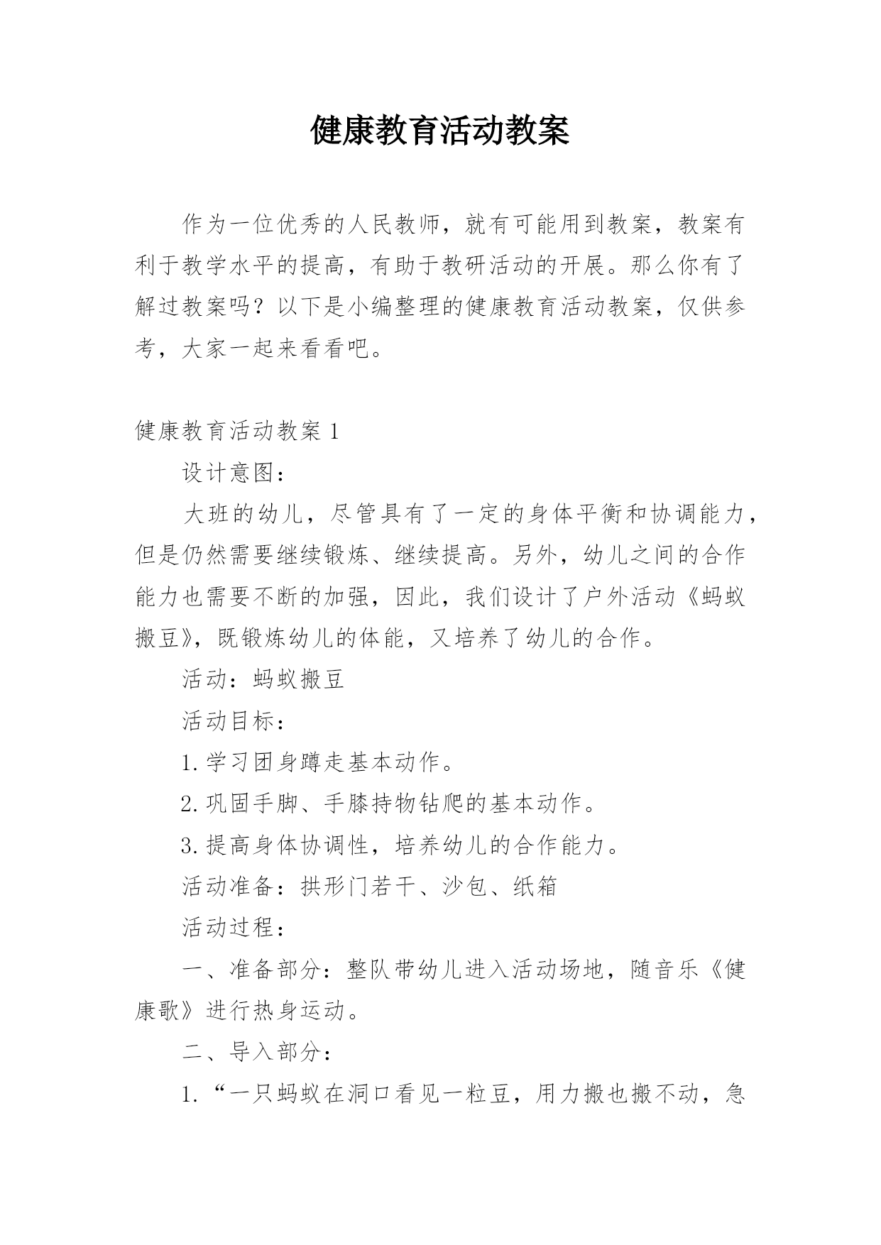 健康教育活动教案作为一位优秀的人民教师,就有可能用到教案,教案有利于教学水平的提高,有助于教研活动的开展。那么你有了解过教案吗?以下是小编整理的健康教育活动教案,仅供参考,大家一起来看看吧。健康教育活动教案1设计意图:大班的幼儿,尽管具有了一定的身体平衡和协调能力,但是仍然需要继续锻炼、继续提高。另外,幼儿之间的合作能力也需要不断的加强,因此,我们设计了户外活动《蚂蚁搬豆》,既锻炼幼儿的体能,又培养了幼儿的合作。活动:蚂蚁搬豆活动目标:1.学习团身蹲走基本动作。2.巩固手脚、手膝持物钻爬的基本动作。3.提