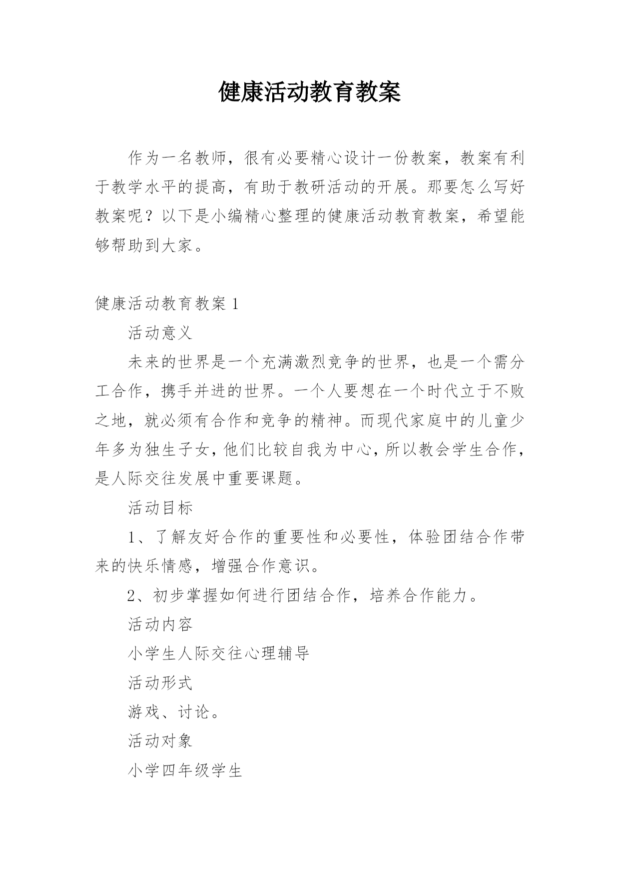 健康活动教育教案作为一名教师,很有必要精心设计一份教案,教案有利于教学水平的提高,有助于教研活动的开展。那要怎么写好教案呢?以下是小编精心整理的健康活动教育教案,希望能够帮助到大家。健康活动教育教案1活动意义未来的世界是一个充满激烈竞争的世界,也是一个需分工合作,携手并进的世界。一个人要想在一个时代立于不败之地,就必须有合作和竞争的精神。而现代家庭中的儿童少年多为独生子女,他们比较自我为中心,所以教会学生合作,是人际交往发展中重要课题。活动目标1、了解友好合作的重要性和必要性,体验团结合作带来的快乐情感,