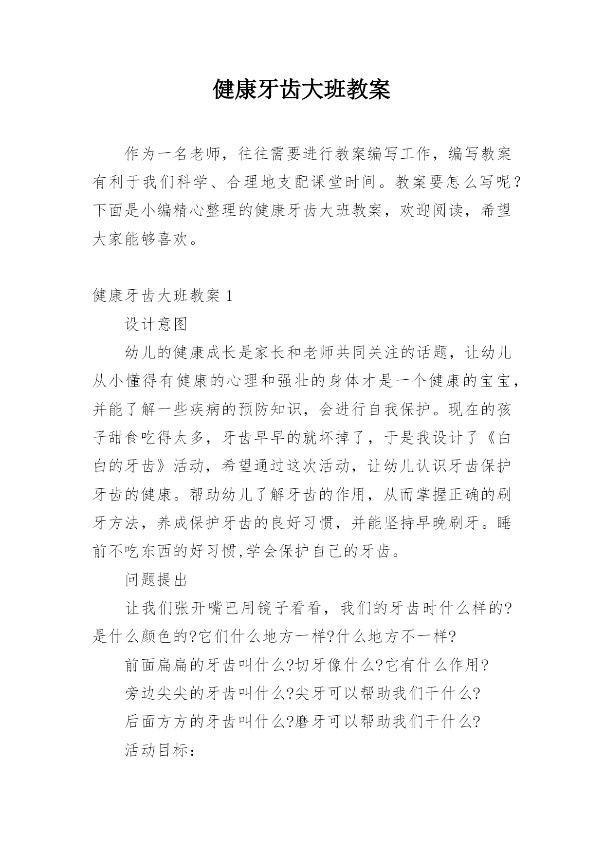 健康牙齿大班教案作为一名老师,往往需要进行教案编写工作,编写教案有利于我们科学、合理地支配课堂时间。教案要怎么写呢?下面是小编精心整理的健康牙齿大班教案,欢迎阅读,希望大家能够喜欢。健康牙齿大班教案1设计意图幼儿的健康成长是家长和老师共同关注的话题,让幼儿从小懂得有健康的心理和强壮的身体才是一个健康的宝宝,并能了解一些疾病的预防知识,会进行自我保护。现在的孩子甜食吃得太多,牙齿早早的就坏掉了,于是我设计了《白白的牙齿》活动,希望通过这次活动,让幼儿认识牙齿保护牙齿的健康。帮助幼儿了解牙齿的作用,从而掌握正