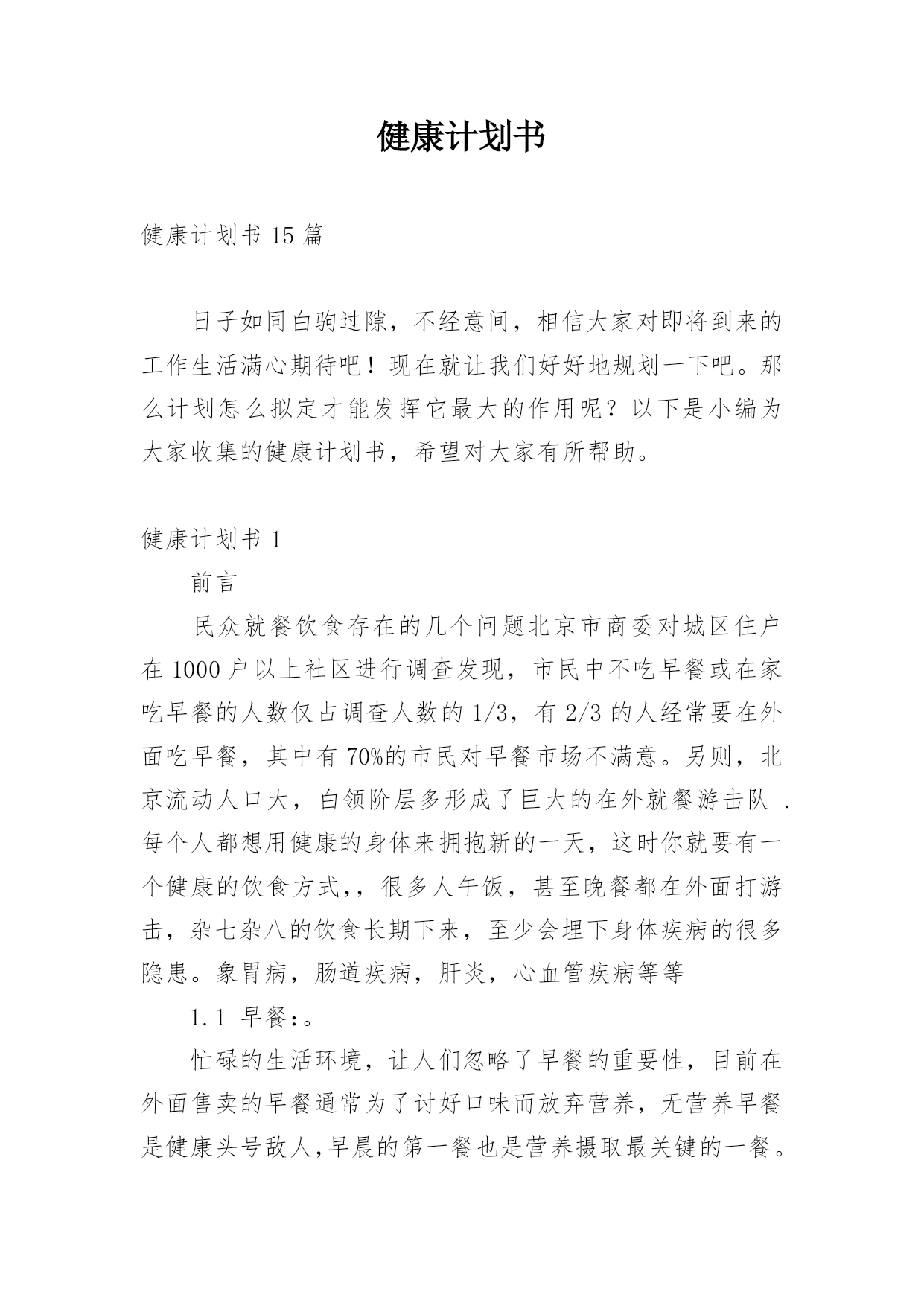 健康计划书健康计划书15篇日子如同白驹过隙,不经意间,相信大家对即将到来的工作生活满心期待吧!现在就让我们好好地规划一下吧。那么计划怎么拟定才能发挥它最大的作用呢?以下是小编为大家收集的健康计划书,希望对大家有所帮助。健康计划书1前言民众就餐饮食存在的几个问题北京市商委对城区住户在1000户以上社区进行调查发现,市民中不吃早餐或在家吃早餐的人数仅占调查人数的1/3,有2/3的人经常要在外面吃早餐,其中有70%的市民对早餐市场不满意。另则,北京流动人口大,白领阶层多形成了巨大的在外就餐游击队.每个人都想用健