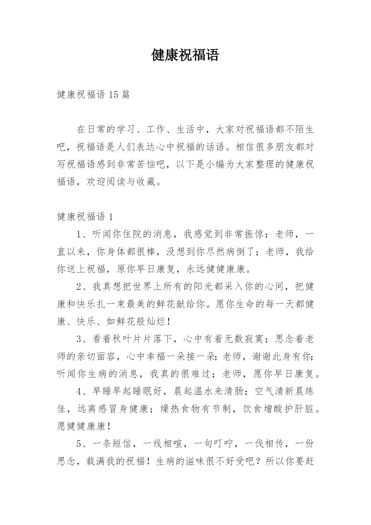 健康祝福语健康祝福语15篇在日常的学习、工作、生活中,大家对祝福语都不陌生吧,祝福语是人们表达心中祝福的话语。相信很多朋友都对写祝福语感到非常苦恼吧,以下是小编为大家整理的健康祝福语,欢迎阅读与收藏。健康祝福语11、听闻你住院的消息,我感觉到非常振惊;老师,一直以来,你身体都很棒,没想到你尽然病倒了;老师,我给你送上祝福,原你早日康复,永远健健康康。2、我真想把世界上所有的阳光都采入你的心间,把健康和快乐扎一束最美的鲜花献给你。愿你生命的每一天都健康、快乐、如鲜花般灿烂!3、看着秋叶片片落下,心中有着无数