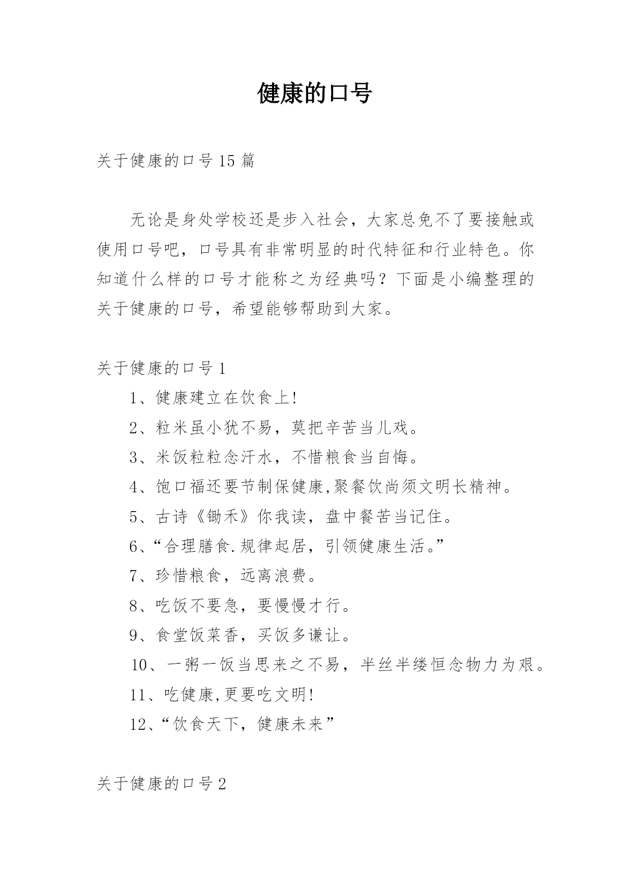 健康的口号关于健康的口号15篇无论是身处学校还是步入社会,大家总免不了要接触或使用口号吧,口号具有非常明显的时代特征和行业特色。你知道什么样的口号才能称之为经典吗?下面是小编整理的关于健康的口号,希望能够帮助到大家。关于健康的口号11、健康建立在饮食上!2、粒米虽小犹不易,莫把辛苦当儿戏。3、米饭粒粒念汗水,不惜粮食当自悔。4、饱口福还要节制保健康,聚餐饮尚须文明长精神。5、古诗《锄禾》你我读,盘中餐苦当记住。6、“合理膳食.规律起居,引领健康生活。”7、珍惜粮食,远离浪费。8、吃饭不要急,要慢慢才行。9