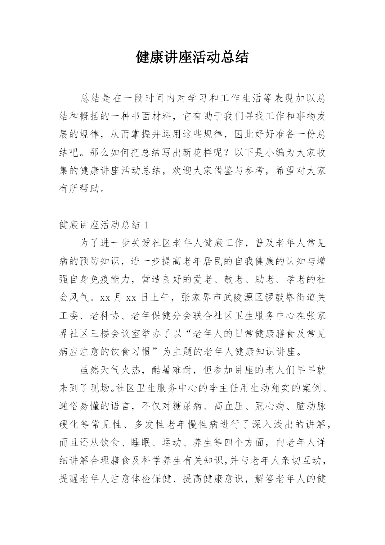 健康讲座活动总结总结是在一段时间内对学习和工作生活等表现加以总结和概括的一种书面材料,它有助于我们寻找工作和事物发展的规律,从而掌握并运用这些规律,因此好好准备一份总结吧。那么如何把总结写出新花样呢?以下是小编为大家收集的健康讲座活动总结,欢迎大家借鉴与参考,希望对大家有所帮助。健康讲座活动总结1为了进一步关爱社区老年人健康工作,普及老年人常见病的预防知识,进一步提高老年居民的自我健康的认知与增强自身免疫能力,营造良好的爱老、敬老、助老、孝老的社会风气。xx月xx日上午,张家界市武陵源区锣鼓塔街道关工委、
