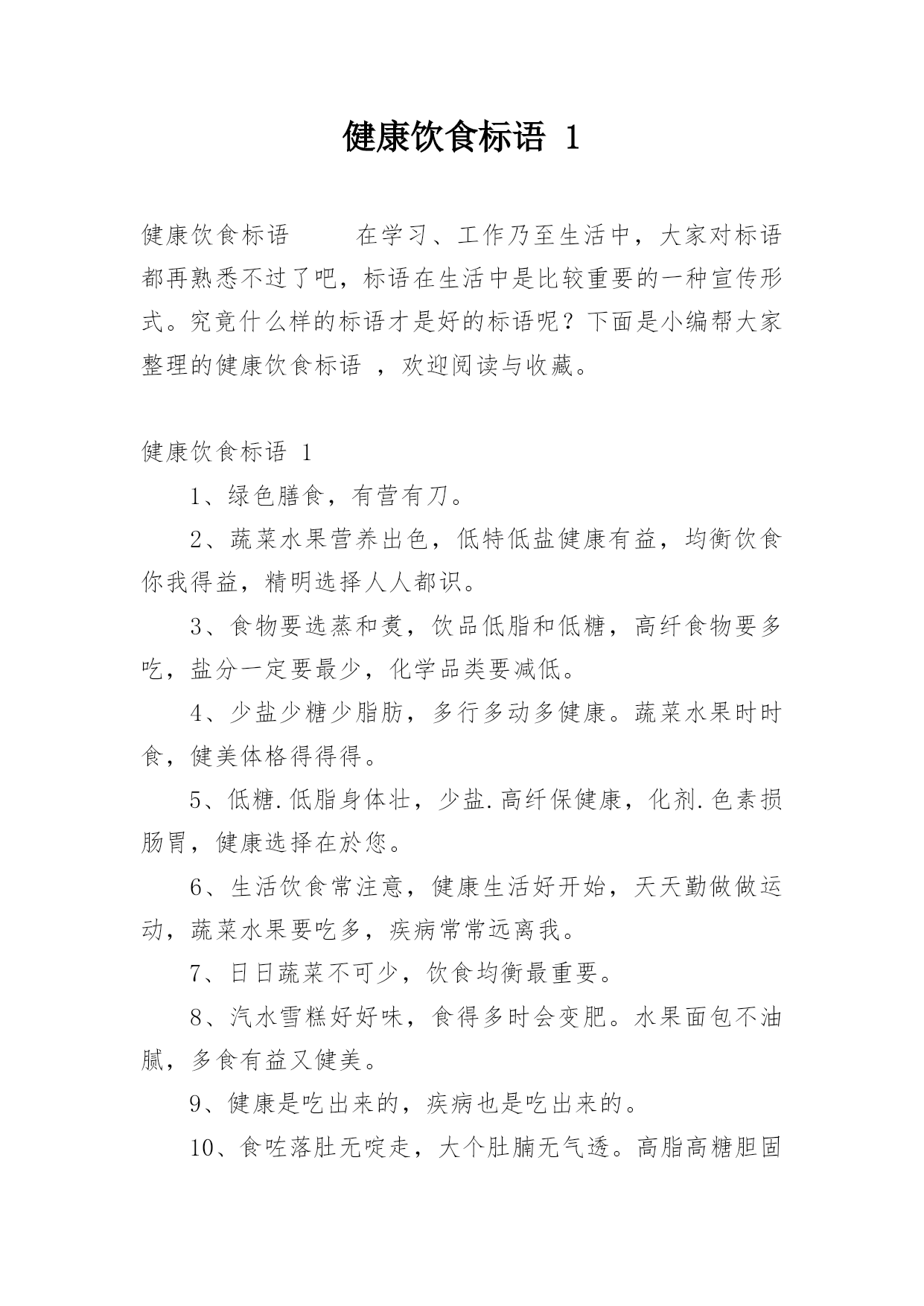健康饮食标语1健康饮食标语在学习、工作乃至生活中,大家对标语都再熟悉不过了吧,标语在生活中是比较重要的一种宣传形式。究竟什么样的标语才是好的标语呢?下面是小编帮大家整理的健康饮食标语,欢迎阅读与收藏。健康饮食标语11、绿色膳食,有营有刀。2、蔬菜水果营养出色,低特低盐健康有益,均衡饮食你我得益,精明选择人人都识。3、食物要选蒸和煑,饮品低脂和低糖,高纤食物要多吃,盐分一定要最少,化学品类要减低。4、少盐少糖少脂肪,多行多动多健康。蔬菜水果时时食,健美体格得得得。5、低糖.低脂身体壮,少盐.高纤保健康,化剂